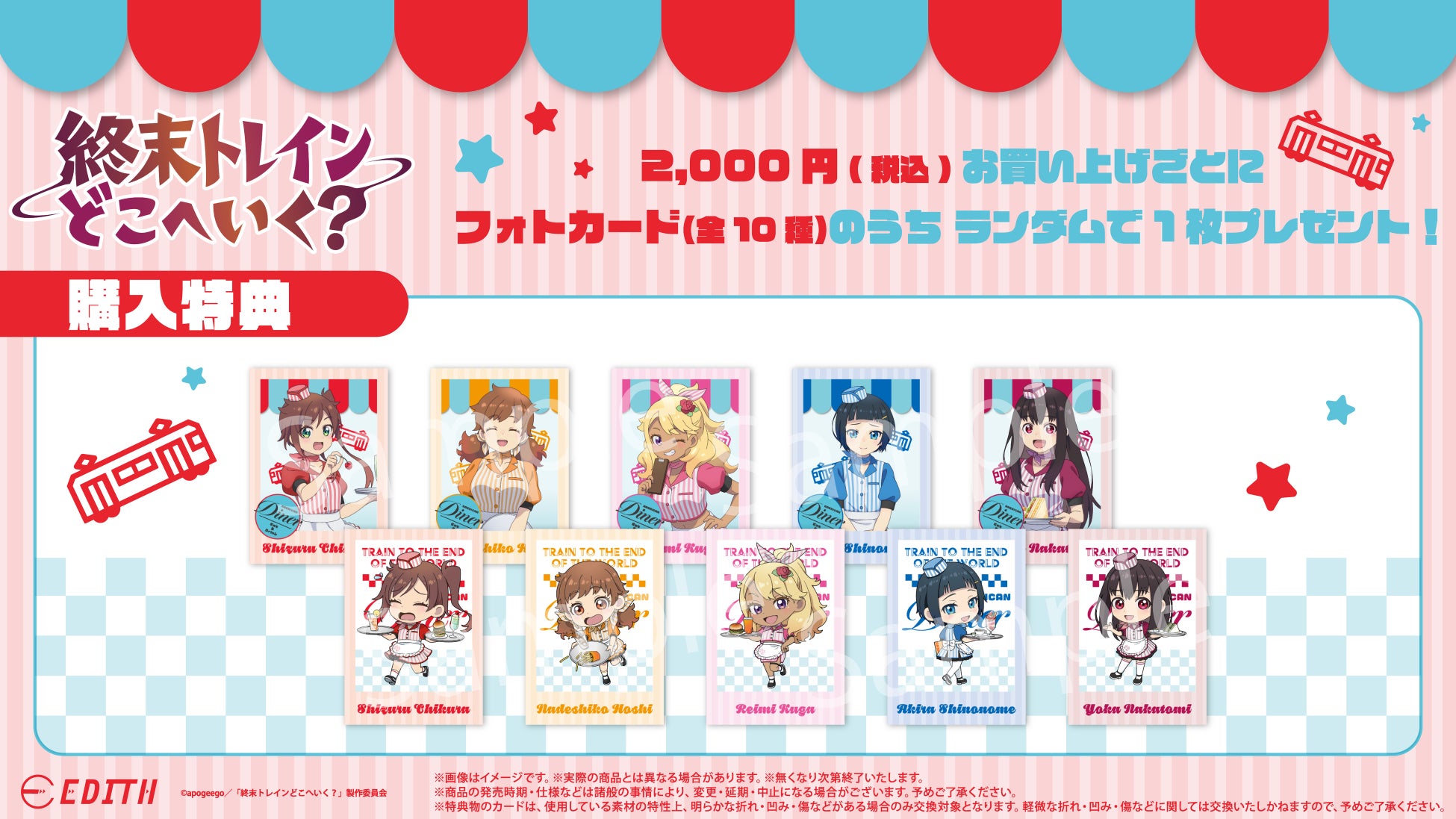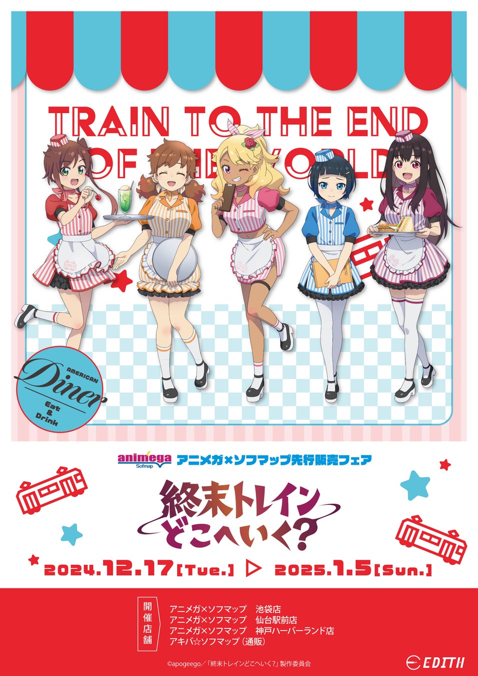 株式会社イーディス(本社:東京都豊島区、代表取締役:森俊平)は、TVアニメ『終末トレインどこへいく?』オリジナルイラスト「アメリカンダイナー」を使用した商品をアニメガ×ソフマップで先行販売いたします。
