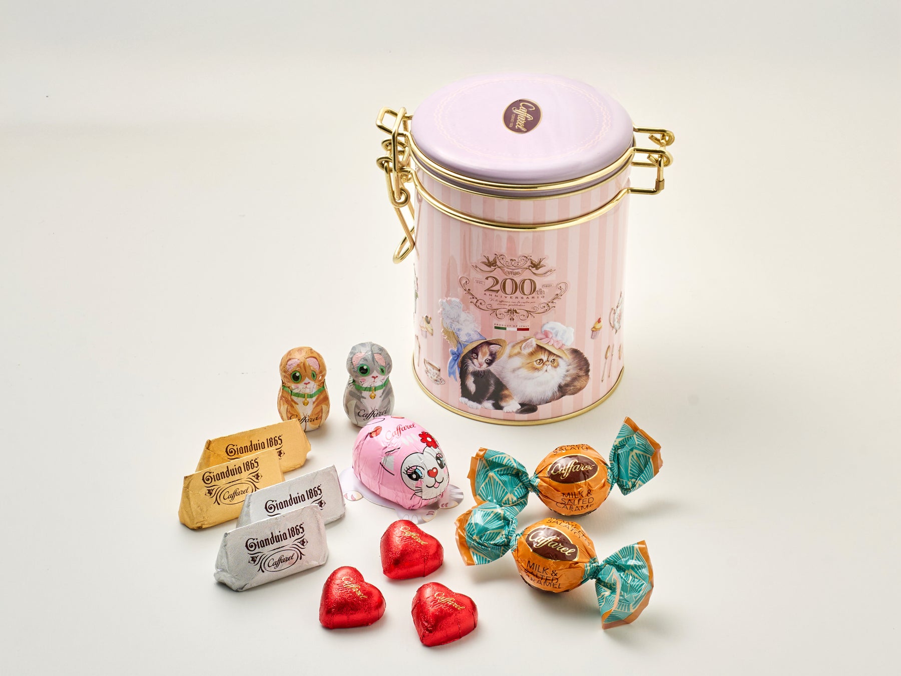 詳細:淡いピンクのストライプにラベンダーカラーの蓋、金色の留め具が華やかなキャニスター缶。200周年のロゴに加え、おめかし帽で装った2匹のねこと甘くて優雅なティータイムセットが可愛らしさを演出。中にはカファレル定番人気のジャンドゥーヤをはじめジャンドゥーヤビター、ソルテッドキャラメルやねこ、ミニハートなどのホイルチョコレート12粒をアソート。