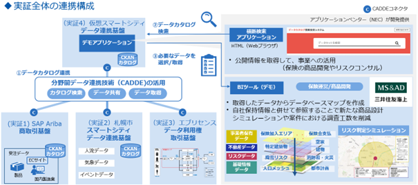実証1)~3)の複数分野のデータ連携基盤とスマートシティのデータ連携基盤をCADDEを介して接続し、相互連携したデータを用いたユースケースを三井住友海上火災保険株式会社とともに検証し、地域のスマートシティの現場を踏まえた技術的課題を抽出しました。具体的には、各実証環境にCKAN*12カタログサイトを配し、横断検索機能*13により検索取得したデータカタログを元にCADDEコネクタを用いてデータを収集、BIツールを用いて分析・可視化することで、保険商品の開発や保険のリスク判定へのデータ活用の可否を検証しました。CADDEにより複数分野のデータ連携が効率的に実施できることを確認したほか、事業者がデータ取引を出口とすることで新たにデータの提供側となることへの有意性も確認できました。今後、CADDEによる分野間データ連携の環境を提供し、事業者が自社の領域を超えた分野でのデータを入手・活用することが可能になれば、業務の効率化やデータ連携による新たな価値の創出につながるユースケースが拡がることが期待されます。