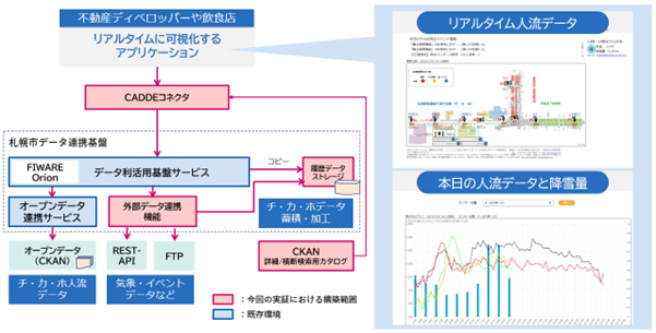 札幌市のデータ連携基盤として利用されているFIWARE OrionとCADDEを相互運用しました。本実証では、不動産ディベロッパーや飲食店が、人流データ、気象データ、イベントデータなどの複数のデータを取得し、リアルタイムに可視化するアプリケーションからデータ活用の可否を検証することで、データ流通における課題を抽出しました。その結果、CADDEにおけるID管理の方法や、マーケティング・業務の最適化につながるデータの詳細化・多様化といった面で課題を確認しました。今後のデータ利活用の本格的な推進に向けて、データの質・量の両面での拡充が進むようデータ提供者側への働きかけも実施していきます。