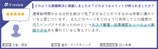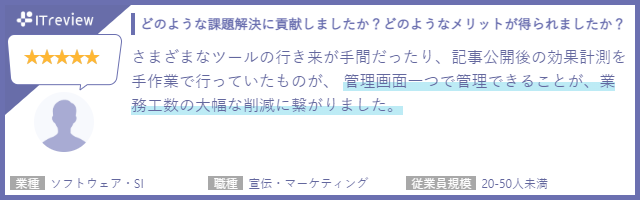 ITreviewにて、SEARCH WRITEを実際に利用いただいているお客様よりたくさんのお声をいただいております。お客様からは「SEOの知識がなくても、何をすべきか分かりやすい」「導入サポートが手厚い」「工数が大幅に削減できた」などのコメントをいただきました。