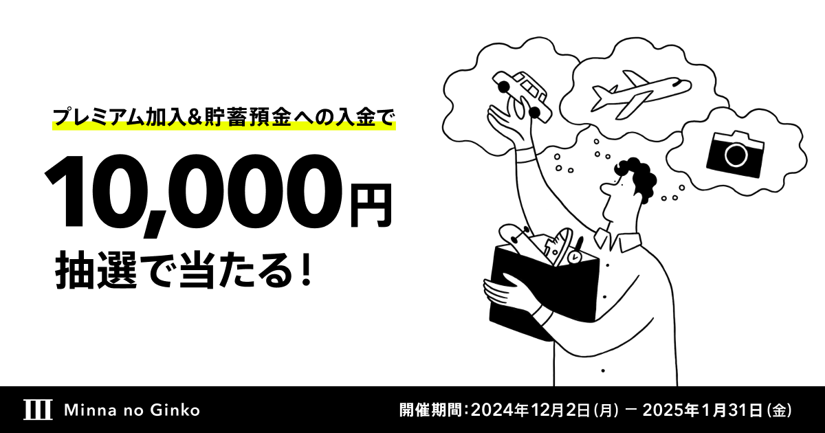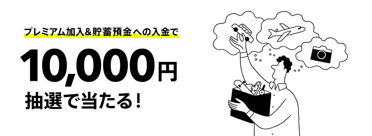 プレミアム会員(*1)の方で、キャンペーン期間中に、みんなの銀行貯蓄預金口座残高(Box、Savingの合計残高)を10万円以上増やしていただいたお客さまを対象に、抽選で現金1万円を100名さまにプレゼントします。