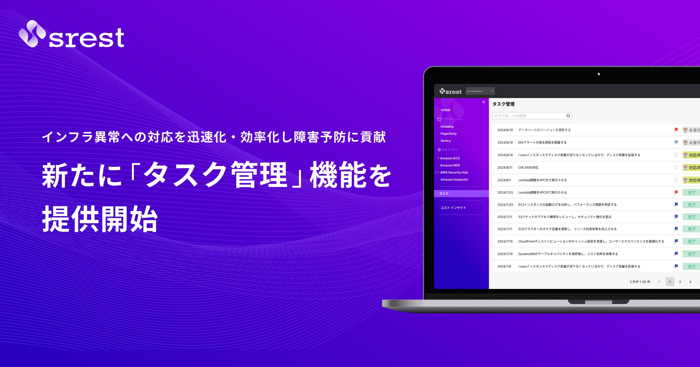 メタップスホールディングス(渋谷区、代表取締役社長 山﨑祐一郎)が提供するAWS横断監視ツール「srest(スレスト)」は、2024年8月22日(木)から新たに「タスク管理機能」を提供開始します。発生したイベントログに対して担当者や期限、ステータスなどの情報を追加可能です。タスクは一覧表示され、対応状況をリアルタイムに把握できます。これにより異常を検知した際の対応の迅速化・効率化を支援し、障害を未然に防ぐことに貢献します。
