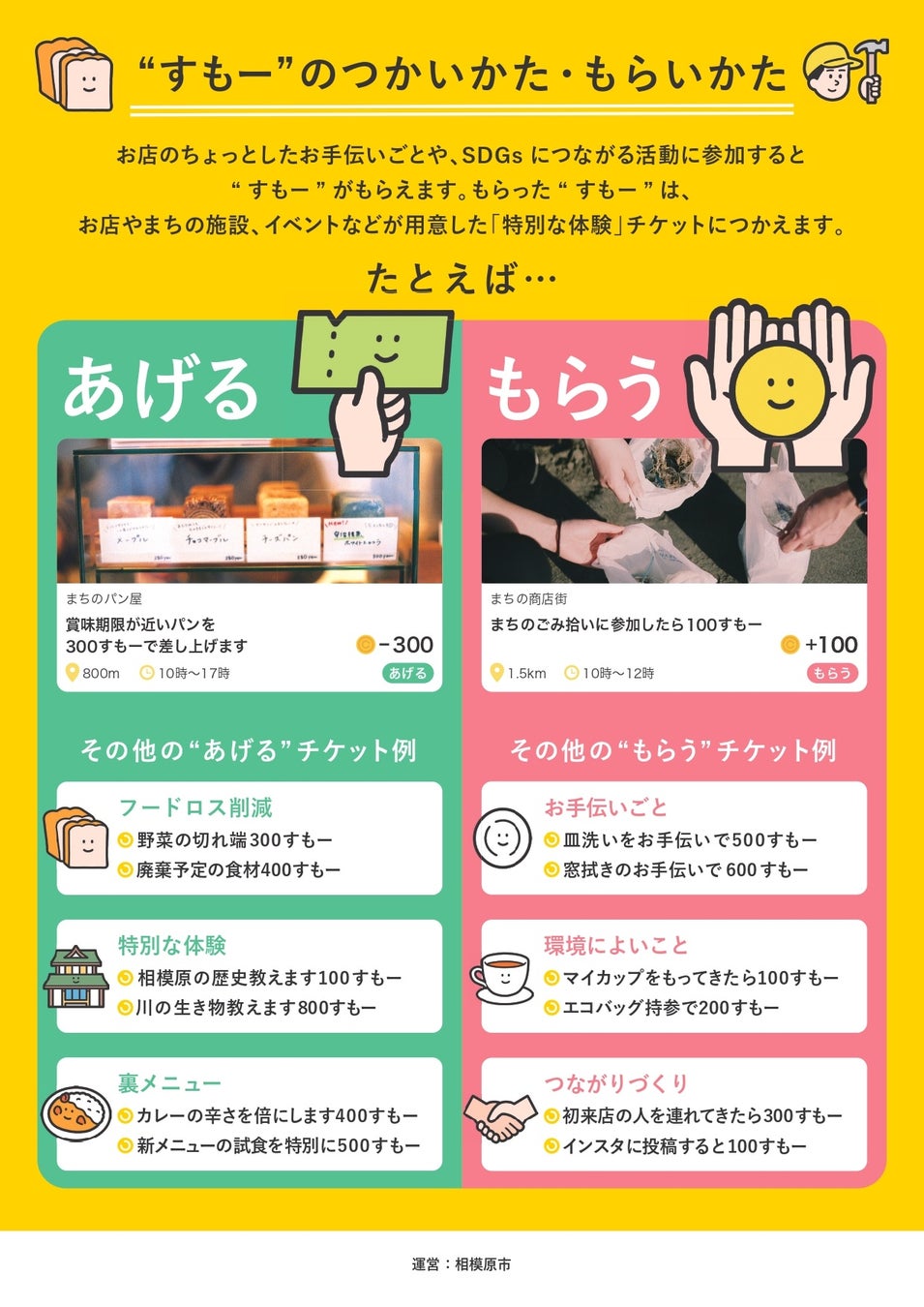 まちのコインアプリをダウンロード後、「相模原」地域を選択し、各地の「スポット」において、チェックインや体験を行うことで、「すもー」を貯める。貯めた「すもー」は、各地の「スポット」等で様々な体験に使用できます。