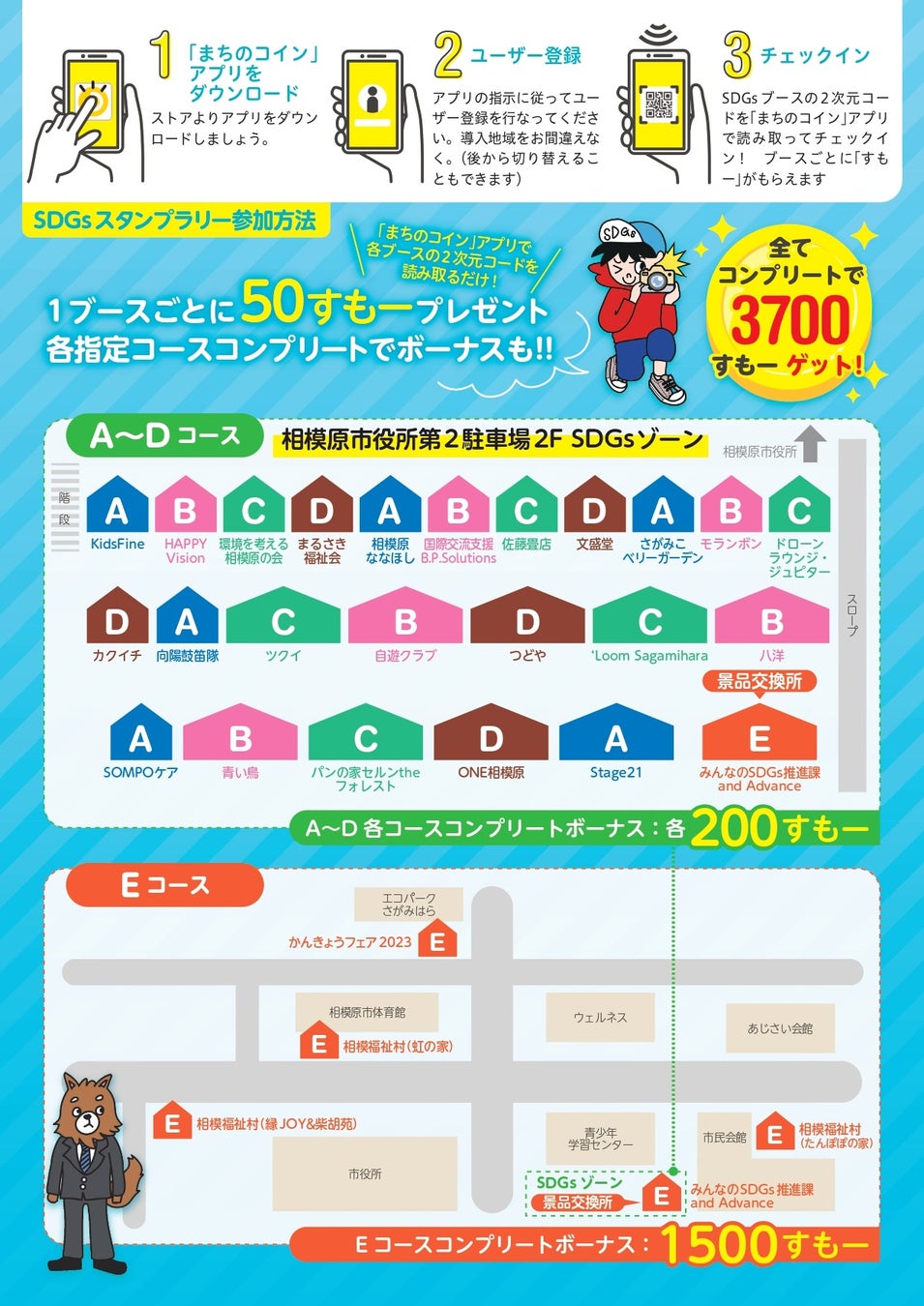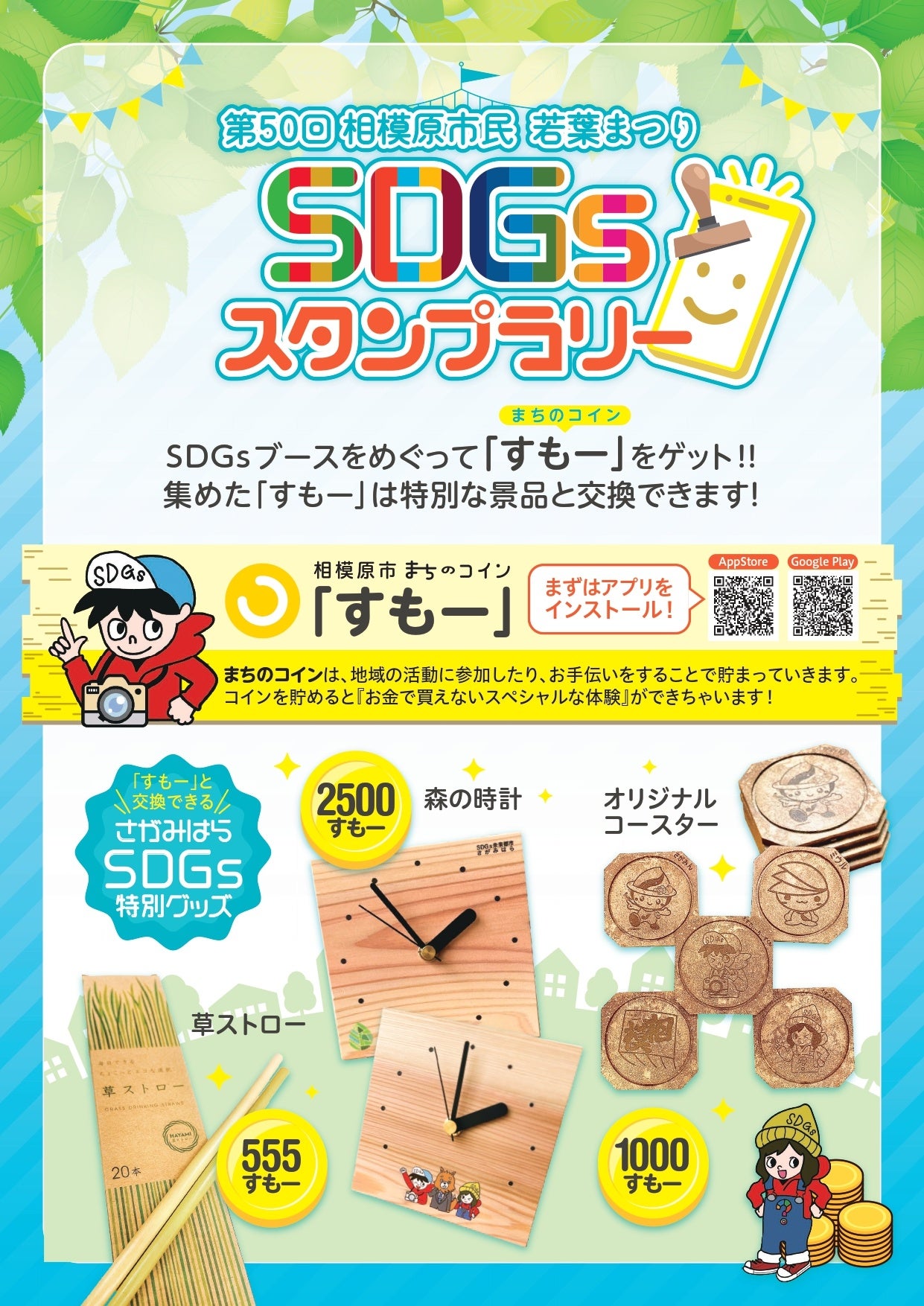 令和5年5月13日(土)、14日(日)に開催される市民若葉まつりのSDGsブース(市役所第2駐車場2階)において、まちのコインを活用したイベントを開催します。SDGsブース(全24ブース)は全てまちのコインの「スポット」になっており、スタンプラリー形式でブースを回るとSDGsに関連したグッズと交換することができます。