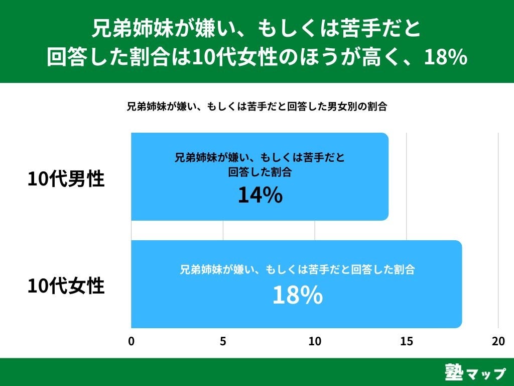 【兄弟姉妹が嫌い、もしくは苦手だと回答した割合は10代女性のほうが高く、18%】