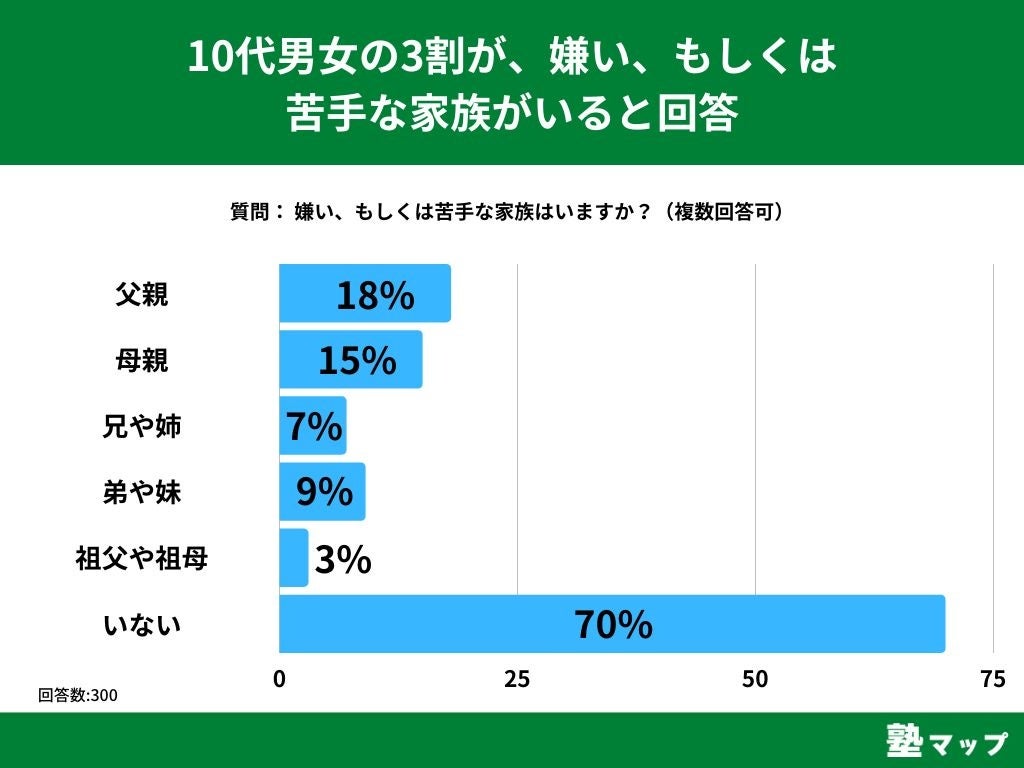 10代の男女を対象とした「嫌い、もしくは苦手な家族はいますか?」というアンケートで最も多かった回答は「いない」で70%でした。