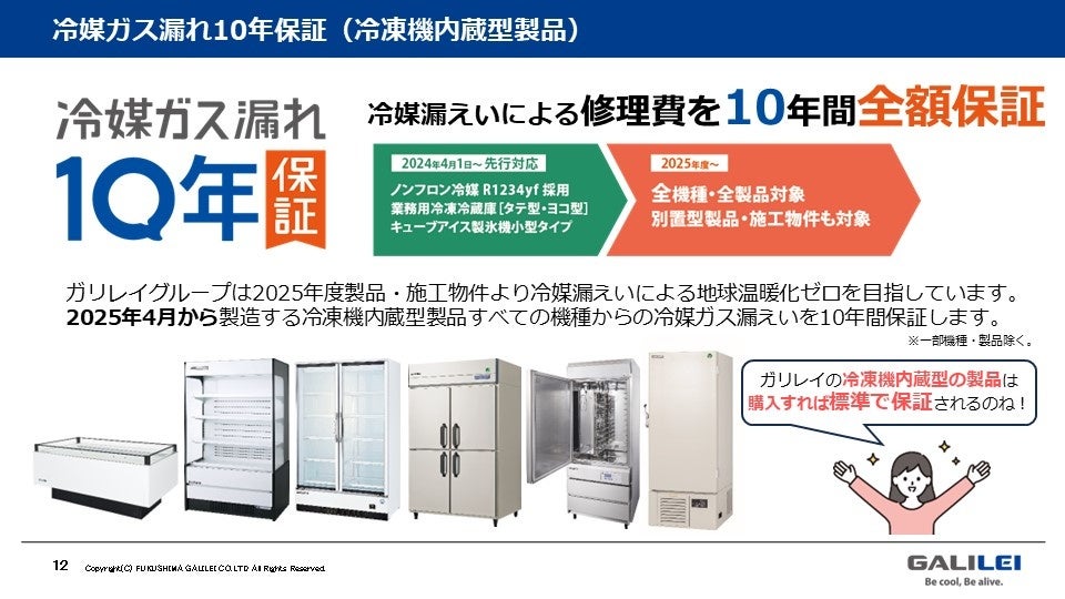 2024年よりノンフロン冷媒R1234yfを採用した業務用冷凍冷蔵庫タテ型・ヨコ型、製氷機に関して、冷媒漏えいによる修理費を10年間全額保証する冷媒ガス漏れ10年保証を開始しておりましたが、2025年4月よりその対象を当社製造の冷凍機内蔵型製品の全機種に拡大いたします。※一部機種除く