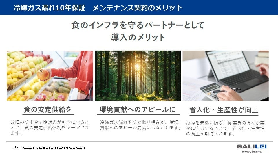 今後もフクシマガリレイは、冷媒漏えいによる地球温暖化ゼロ、そしてガス漏れによる冷却不良のフードロス削減をはじめとした社会課題の解決に取り組んでまいります。
