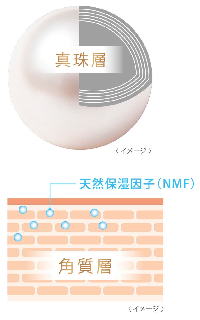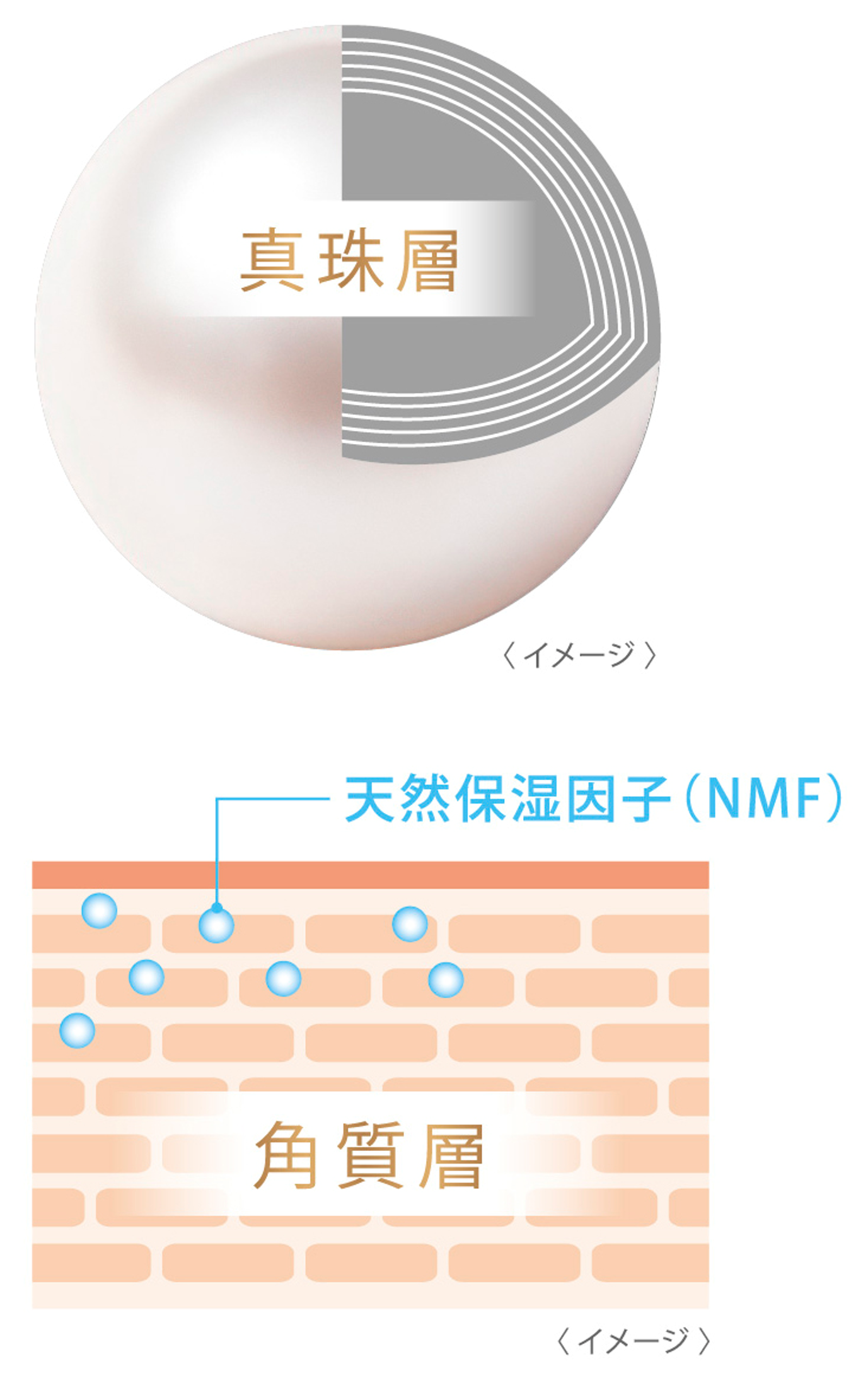 ※1 真珠の構成要素と同種類の12の非動物性由来のアミノ酸(アスパラギン酸、トレオニン、セリン、グルタミン酸、グリシン、アラニン、バリン、イソロイシン、ロイシン、フェニルアラニン、ヒスチジン、アルギニン):保湿成分