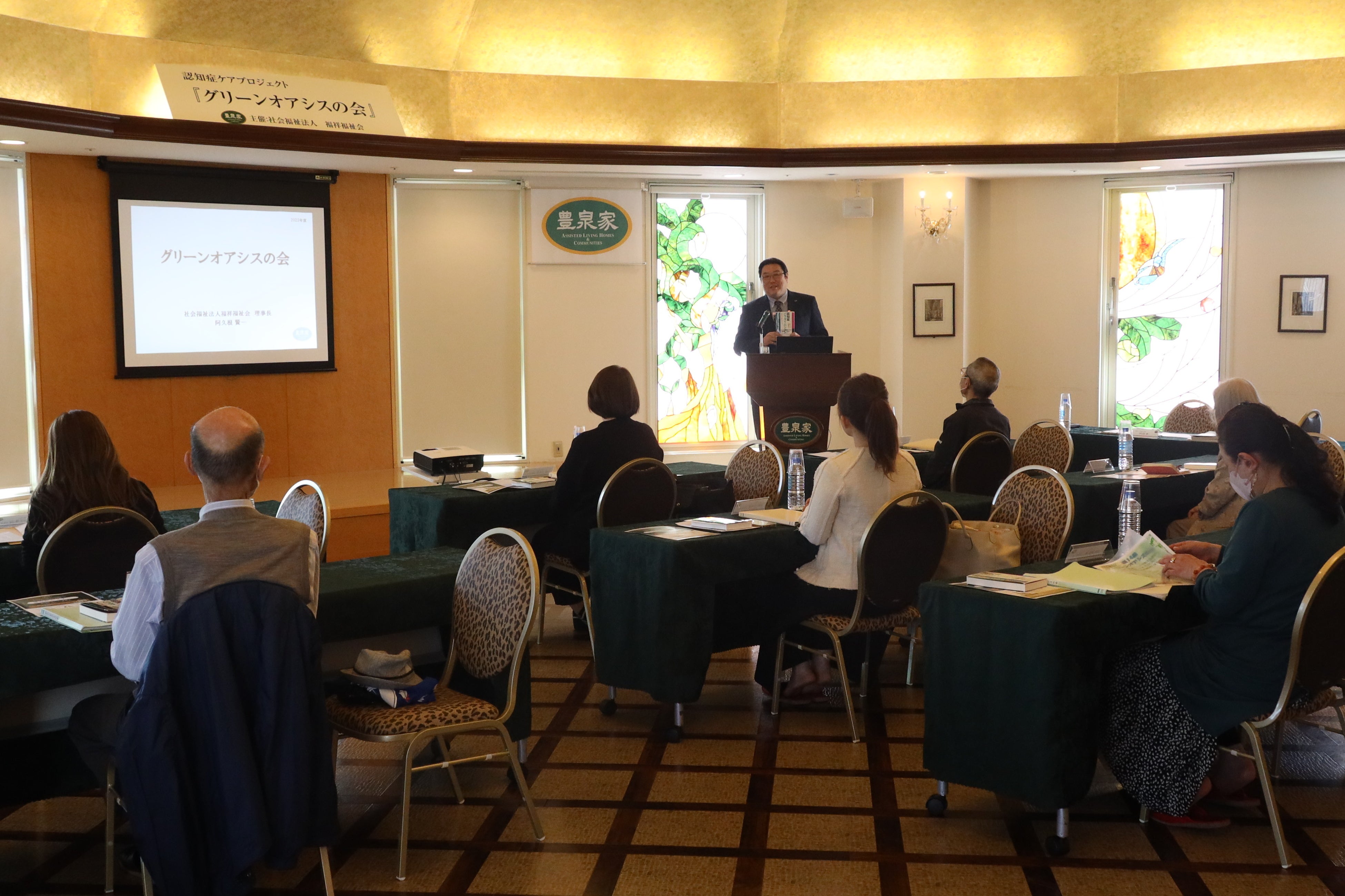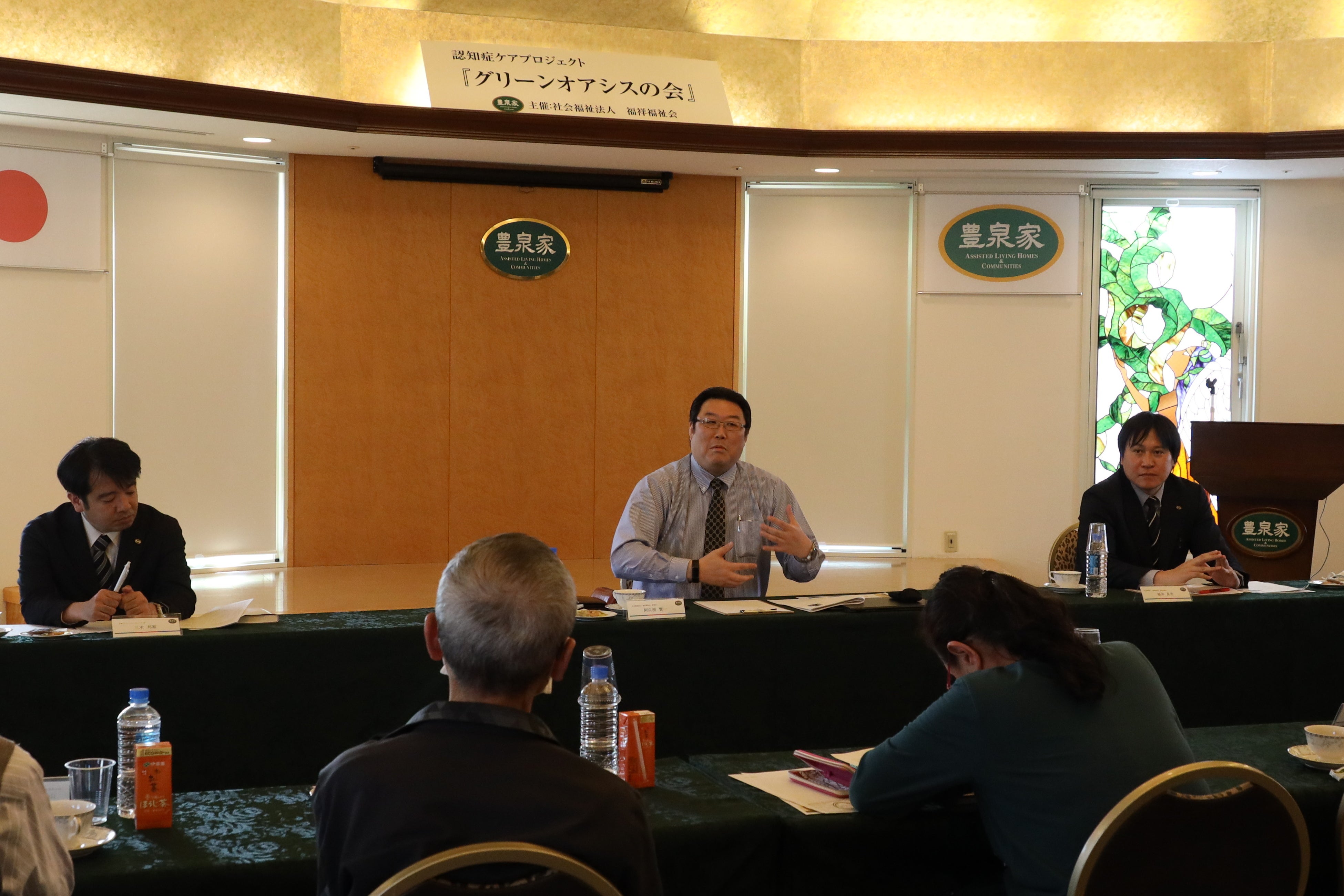 豊泉家では、認知症で苦しまれている方々が少しでも負担を減らし、心豊かな生活を過ごしていただくため、プロジェクトを立ち上げ、長年にわたり日々研鑽を積み上げております。この認知症家族の会「グリーンオアシスの会」では、ご家族のお話しを傾聴し、お困りごとに対してアドバイスやサポートをするとともに、私たちが気づいていない事、知らない事を伺い、共に解決していくことを目的とし、豊泉家の在宅サービスをご利用のご家族を対象に毎月開催しております。