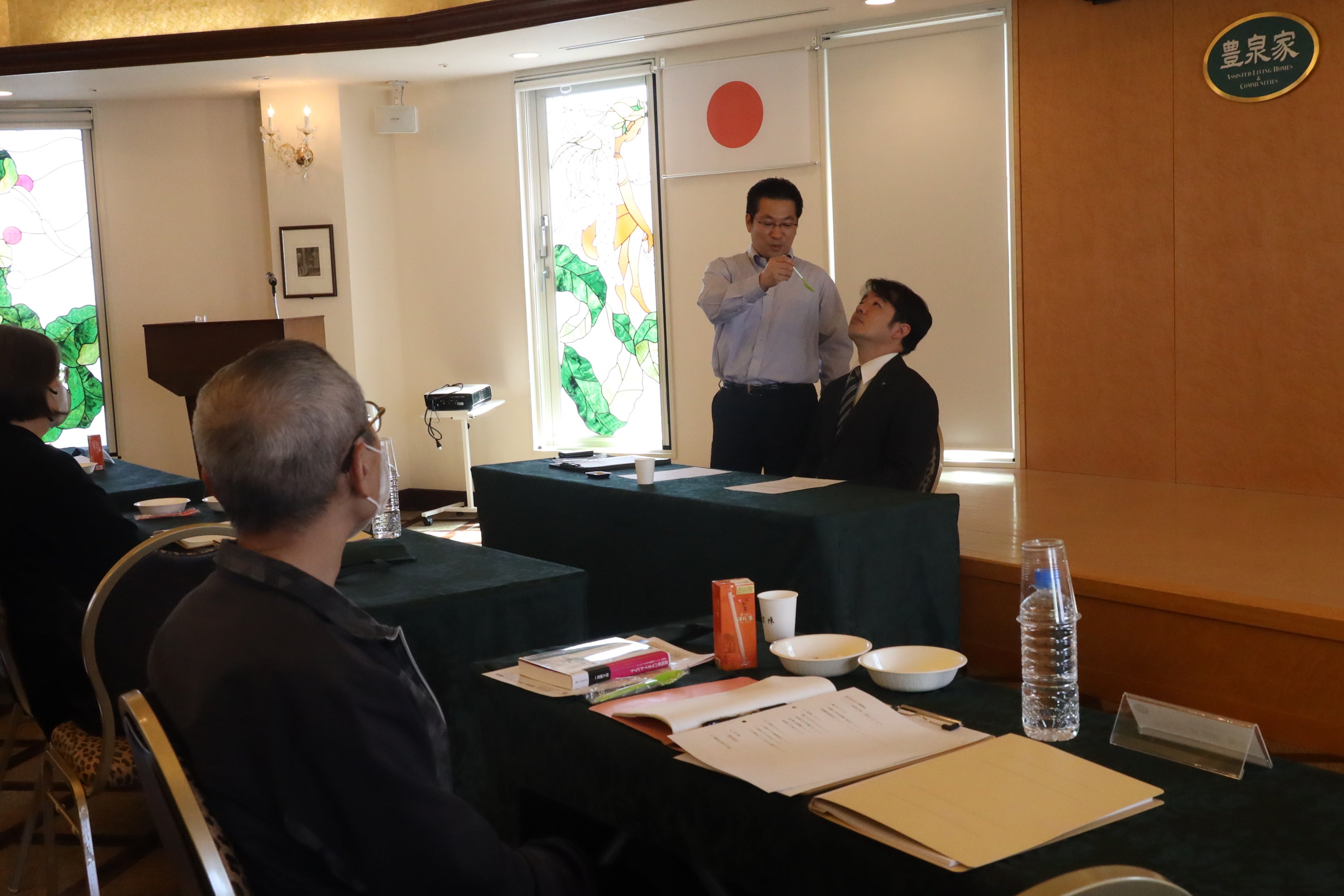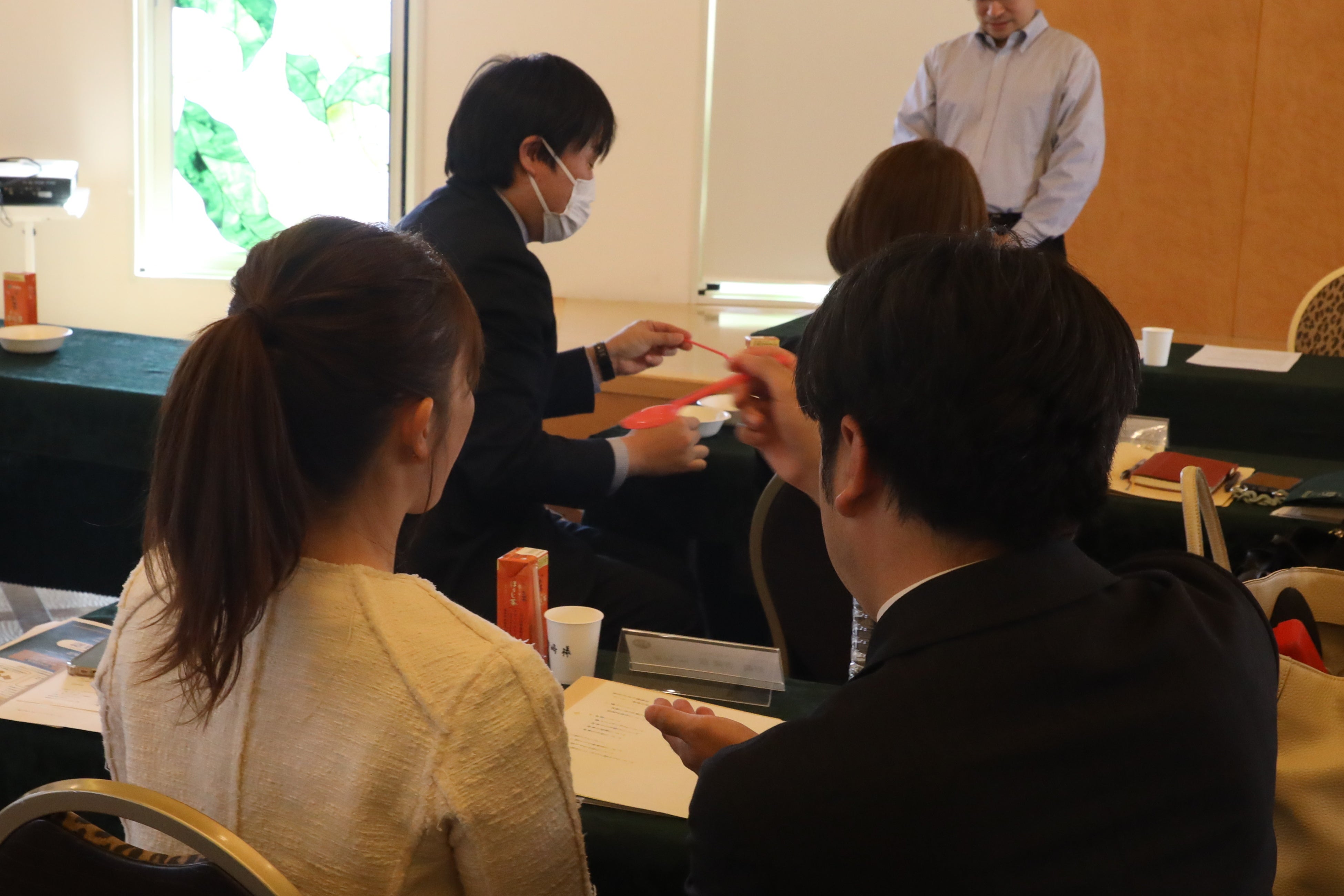 黙って口に食べ物を運び、口に何が入るかわからない場合と、耳からの情報として「ヨーグルトですよ、少しすっぱいかもしれませんよ」などとお伝えしながら口に運ぶときとの違いや、右手で口に運んだ場合と、左手で運んだ場合の違いなどを、介助される側として体感していただき、安心・安全な食事介助の仕方を説明しました。