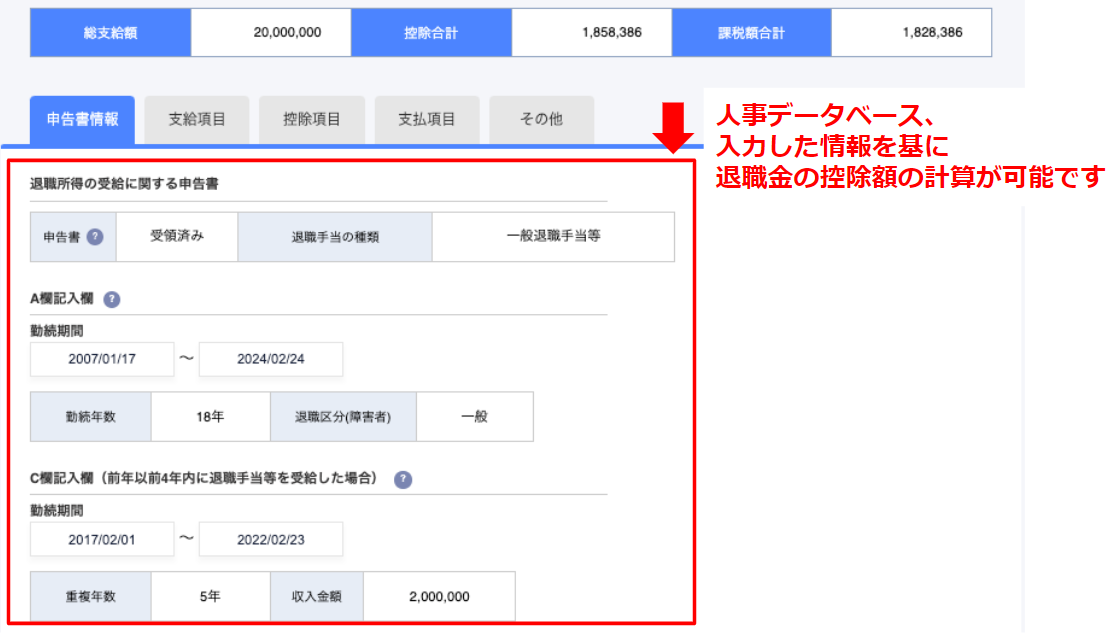 勤続年数に応じて、退職所得控除額、課税退職所得を計算することが可能になります。