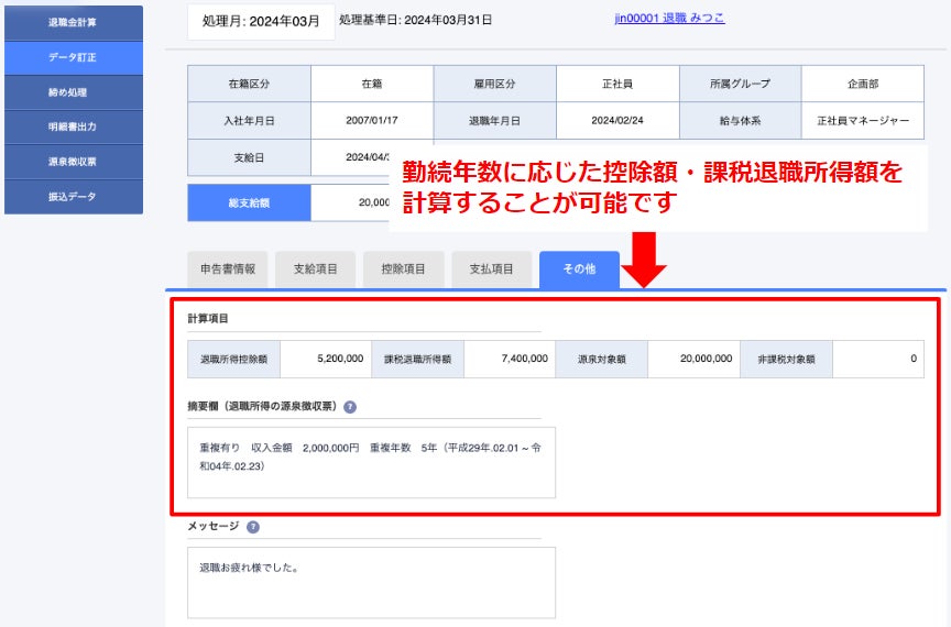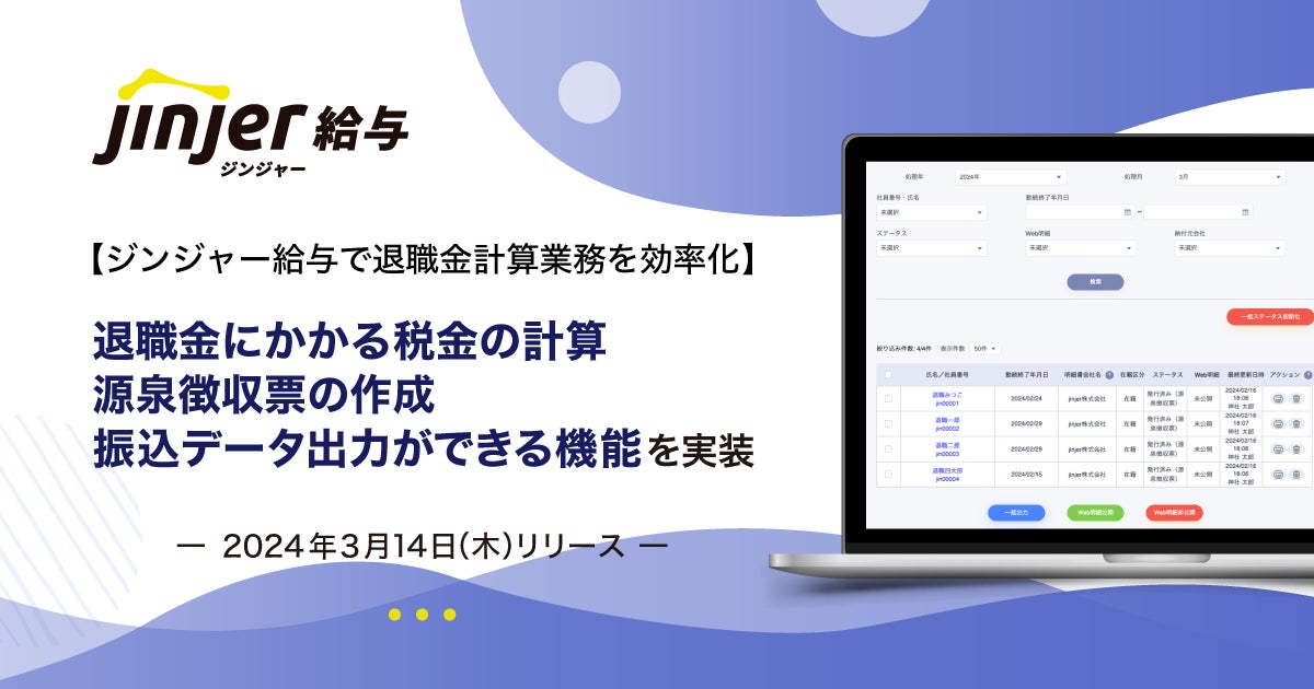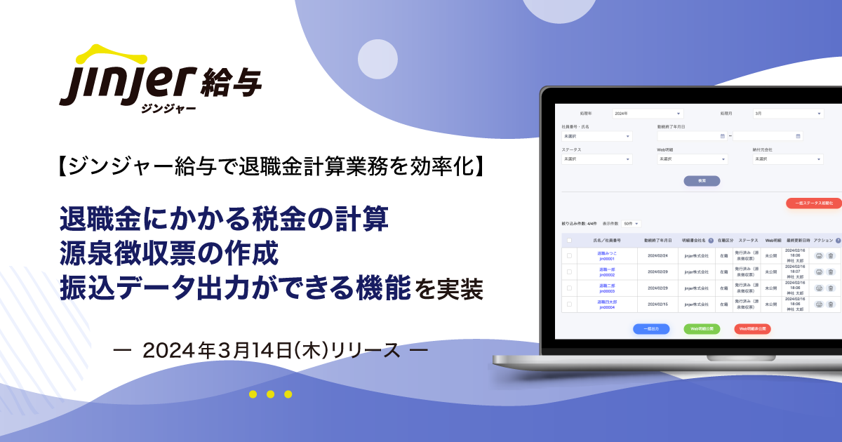【ジンジャー給与で、退職金計算業務を効率化】退職金にかかる税金の計算、源泉徴収票の作成、振込データ出力ができる機能を実装