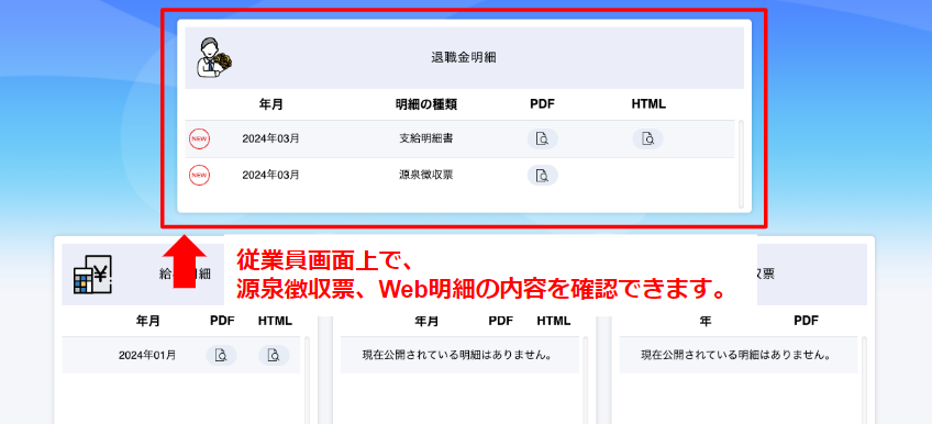 発行された「退職金の明細書」、「源泉徴収票」は、従業員画面でも確認することが可能です。