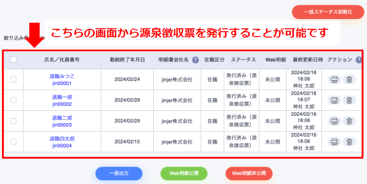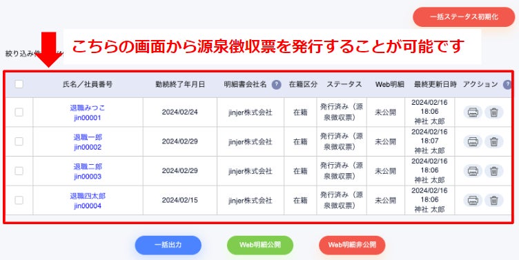 ▶管理者側で行う、明細書・源泉徴収票の出力画面