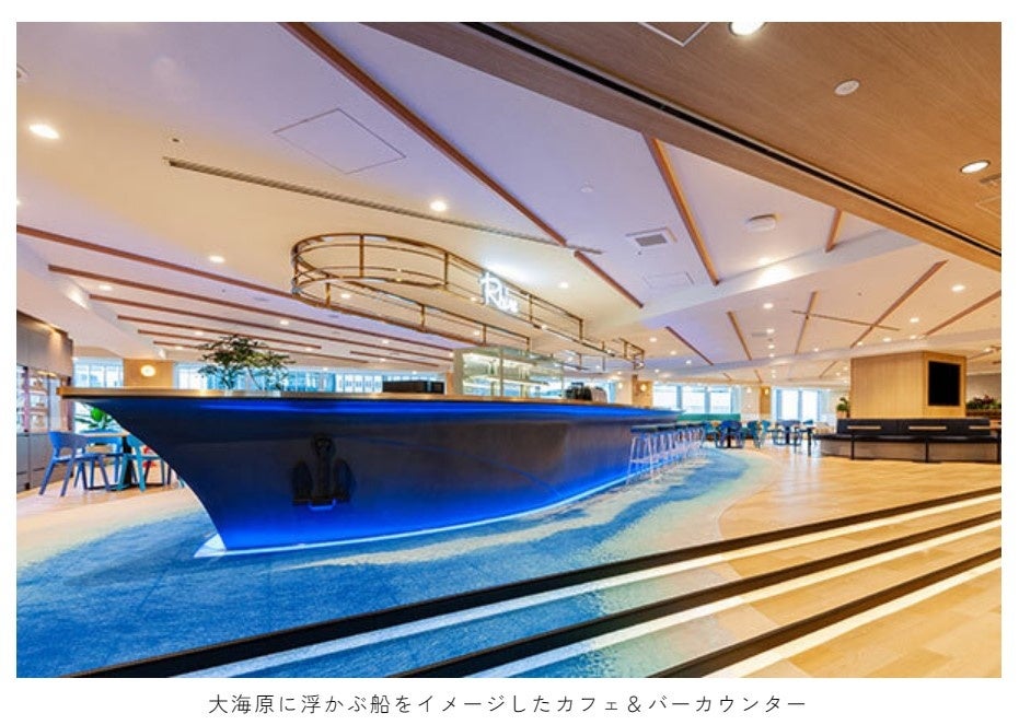 船をイメージしてデザインされたカフェ&バーカウンターでは、朝はモーニングメニュー、日中はコーヒーブレ