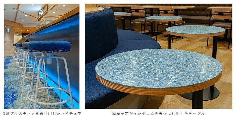 置されているテーブルの天板は、廃棄される予定だったデニムが用いられており、資源の再利用による海洋や地