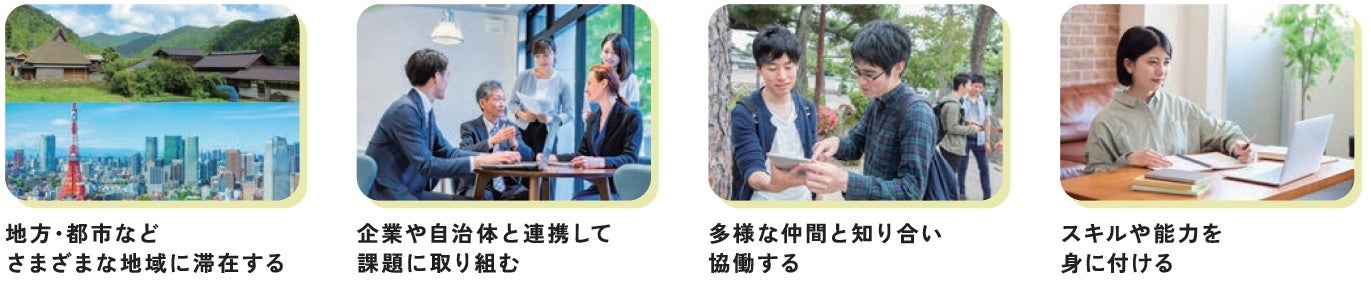 日本各地を拠点にしたフィールドワークで、多様な「地域・企業連携プログラム」を提供します。様々な地域に滞在し、自治体や企業と連携して、問題解決や共同プロジェクトに参加します。社会が変化していく現場に身を置きながら、他者と協働して正解のない問題にじかに取り組むことで、創造性、リーダーシップ、ストレス対処など、実社会で求められる力を身に付けます。
