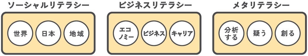 地域・日本・世界の素養を身に付ける「ソーシャルリテラシー」、経済や企業の動きを知り自らのキャリアにつなげる「ビジネスリテラシー」、物事の捉え方や考え方を獲得する「メタリテラシー」のもと科目を構成します。社会に対する若者の幅広い好奇心に応え、人生やキャリアの指針構築を支援することを目指します。