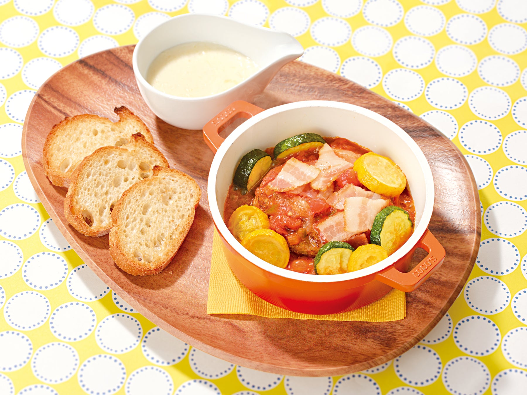 ベーコンやズッキーニなどのたっぷりの具材をあわせたトマトソースがベースのココットハンバーグに、こんがり焼いたバゲットを添えた食べ応え抜群の一品です。サルサでピリ辛に仕上げたトマトソースをみずみずしいズッキーニやジューシーなハンバーグに絡めてお召し上がりください。別添えのチーズクリームソースは、ベシャメルソースを加えコクのある味わいに仕上げました。お好みでかけて、トマトの酸味とニンニクの旨みがまろやかな味わいに変化するのをお楽しみください。