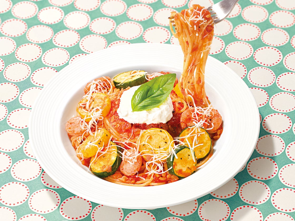 ズッキーニと国産ソーセージのトマトパスタ~クリーミーモッツァレラのせ~ 890円(税込979円)