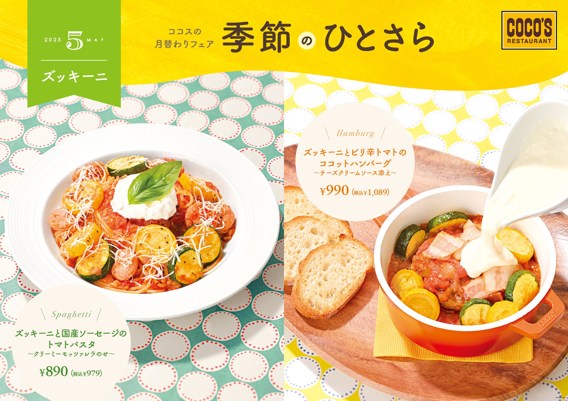 5月のメニューは、旬の食材“ズッキーニ”と初夏にぴったりなピリ辛な味わいがポイントです。素揚げをしたみずみずしいズッキーニは、表面のシャキシャキ食感と実のジューシーな味わいをお楽しみいただけます。ズッキーニのイエローとグリーンが演出する華やかな彩り、サルサソースや唐辛子の程よい辛みをココスの新定番“ココットハンバーグ”と自慢の本格パスタでご堪能ください。