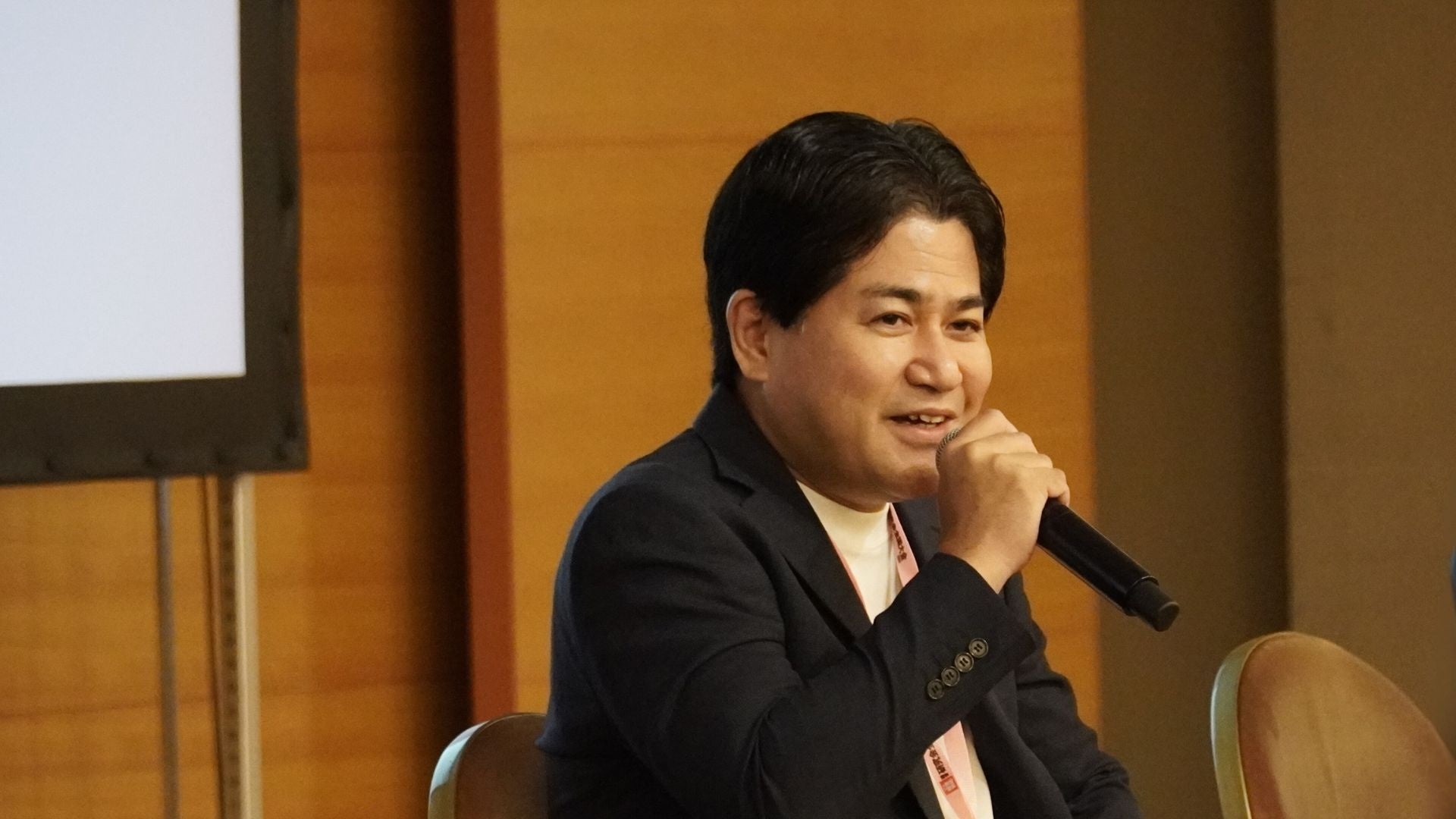 取締役社長の秋間剛が登壇。「広告へのタレント起用の常識を覆す」をテーマに、企業ブランディングを議論