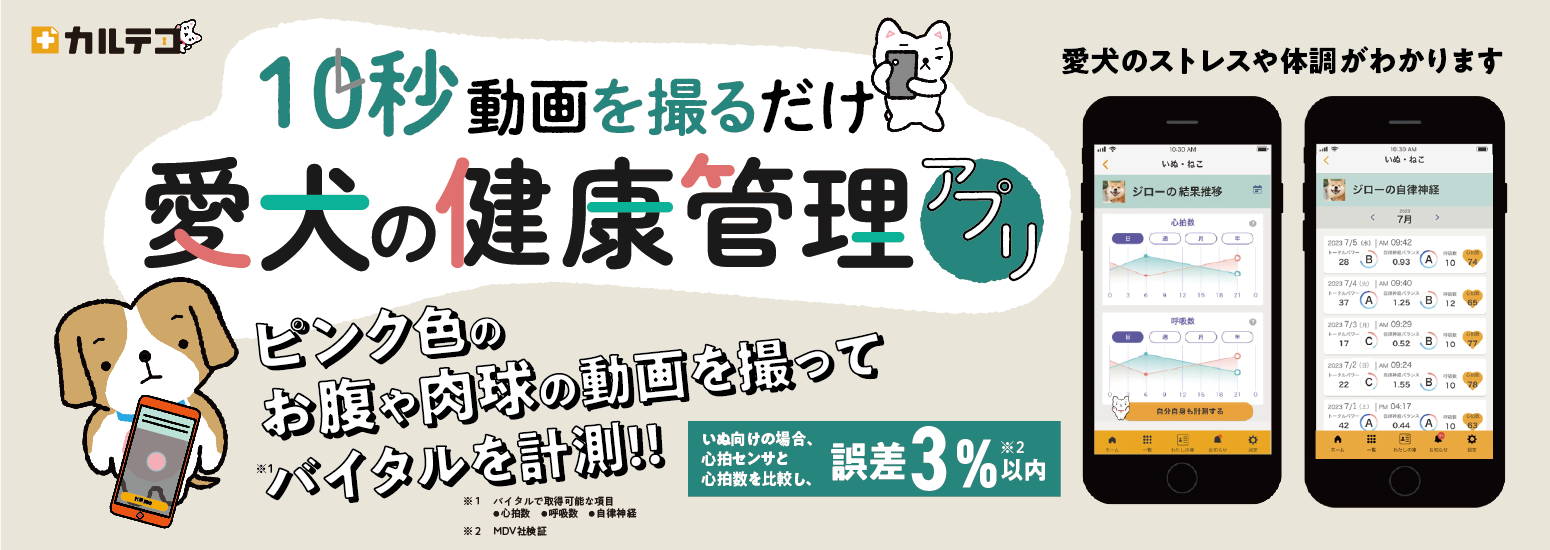 MDVでは非接触型生体情報取得技術(センシング)を搭載し、自身の顔をスマートフォンのカメラで10秒撮影するだけで脈拍数、呼吸数、自律神経のバランスを簡単に把握できるスマートフォンアプリ「カルテコ」を提供しています。センシングはペットへの応用が可能で、まずは先行して犬の自律神経のバランスが計測できるようになり、心拍センサと心拍数を比較し、誤差3%以内の精度を実現しました。(※)