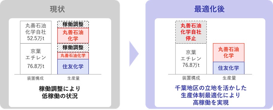 このような背景のもと、丸善石油化学と住友化学は、必要なコストを両社で合理的に負担するという考え方を基本として千葉地区エチレン生産最適化に取り組み、日本で最新かつ最大のエチレン製造装置である京葉エチレンの稼働率向上、固定費削減及びCO2排出量削減を通じて、コンビナートの競争力維持発展及びGXへの対応を進めてまいります。
