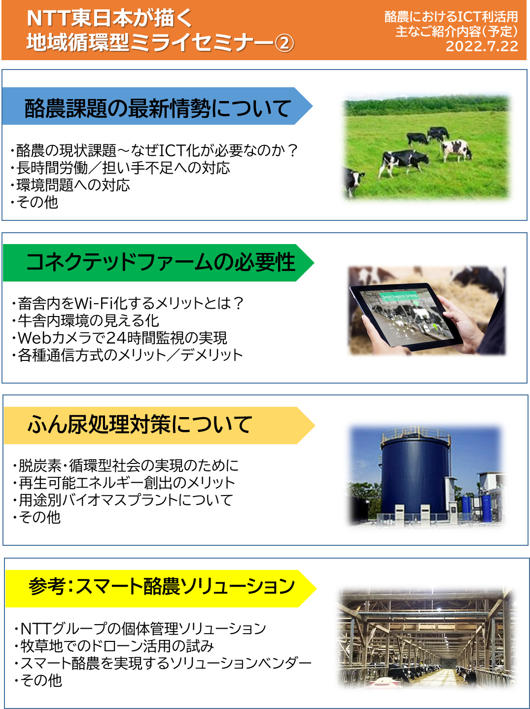 NTT東日本は、2019年度から、ローカル5Gを用いた「自動運転農機」の制御や、センサーを用いた施設園芸の見える化などに取り組んでいます。これまで培ってきたさまざまな経験・知見を基に、本セミナーを通じて農業分野における新たな可能性や価値の創造、地域経済の活性化に貢献してまいります。