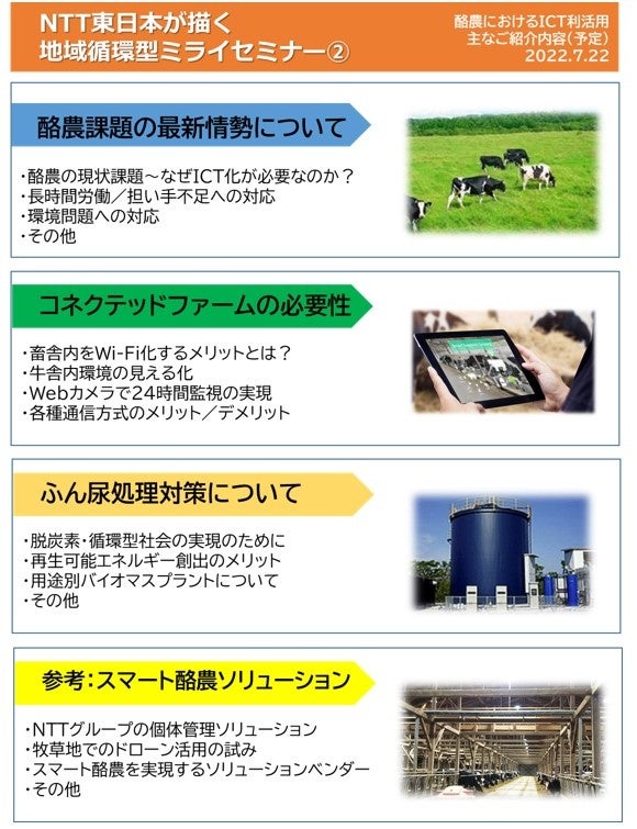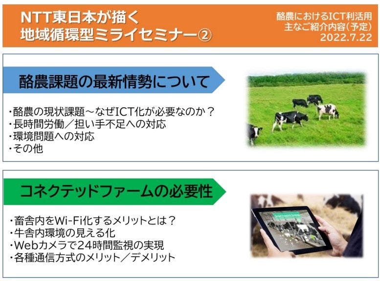 今金町(町長:外崎 秀人)と、東日本電信電話株式会社 北海道事業部(執行役員 北海道事業部長:阿部 隆、以下「NTT東日本」)は、昨年12月に今金町と「社会課題解決に向けたICT利活用に関する連携協定」を締結しました。この度、その取り組み項目のひとつである「生産性向上に向けた農作業スマート化の検討」について、今金町内の酪農事業者を対象とした農業におけるICT活用セミナーを開催いたします。