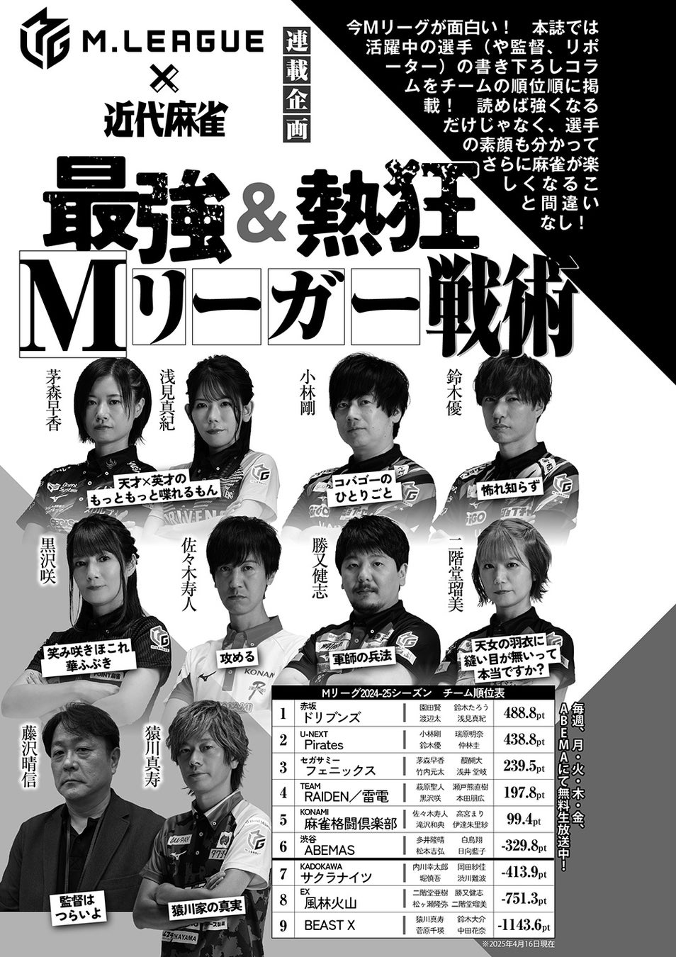 大人気ラインナップ「老境博徒伝 SOGA」「むこうぶち」「ピークアウト」、そしてMリーガーの人生を紐解く「追憶のM」はセガサミーフェニックスの浅井堂岐編、など連載陣に加え、Mリーグ関連戦術記事は10本掲載!!