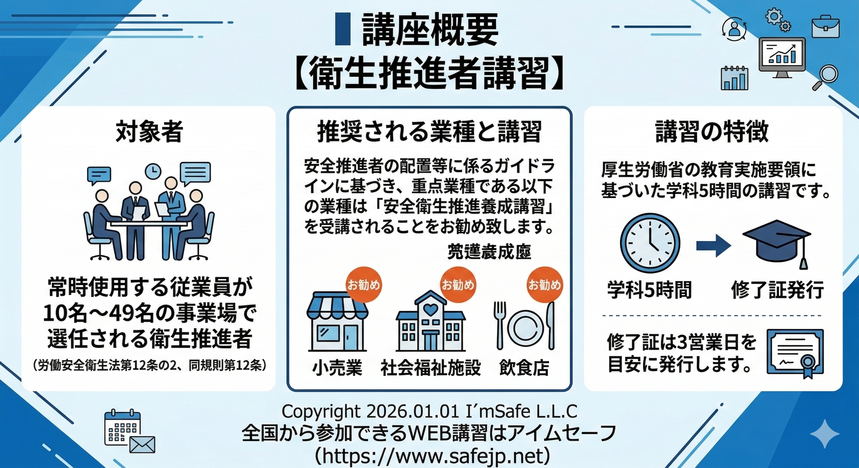 安全推進者の配置等に係るガイドラインに基づき、重点業種である小売業・社会福祉施設・飲食店等の業種は「安全衛生推進養成講習」を受講されることをお勧め致します。