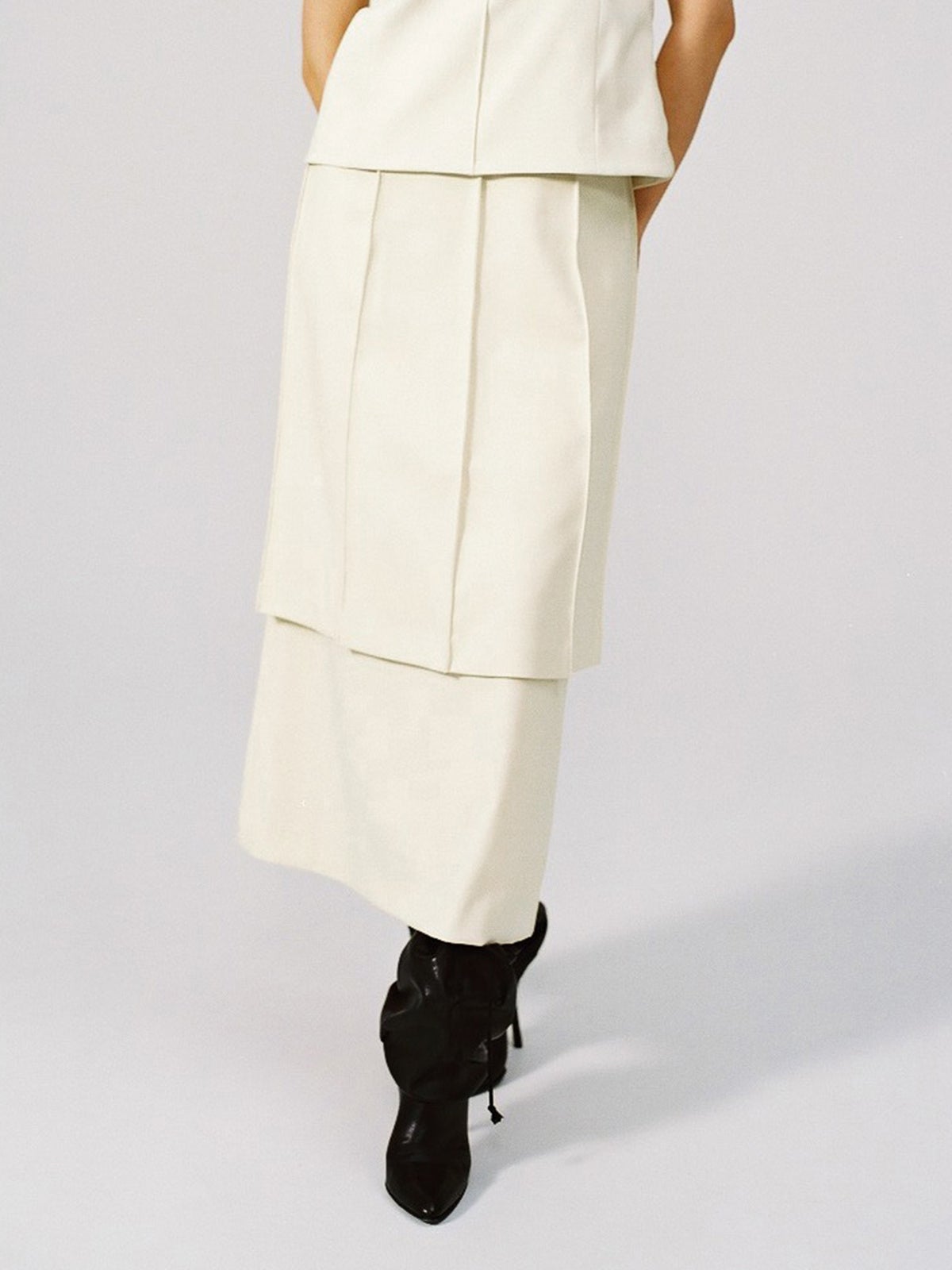 ジャケットは、カーブを描いたフロントデザインが特徴的で、ボタンレスにすることでサッと羽織ることのできる万能アイテであり、またロング丈とミディアム丈のスカートは、単品での活用もできる他、レイヤードスタイルで ワンランク上の着こなしも楽しむことができます。さらに、今回スーツスクエアとして初めてビスチェを企画。ビスチェは、着用するだけで目線が上がりスタイルアップ効果があることから、コーディネートアイテムとして注目されています。今回のデザインは、ビジネスでの着回しを考え、ウエストの絞りを入れないミディアム丈にすることで、どんなボトムスとも相性の良い仕上がりとなっています。