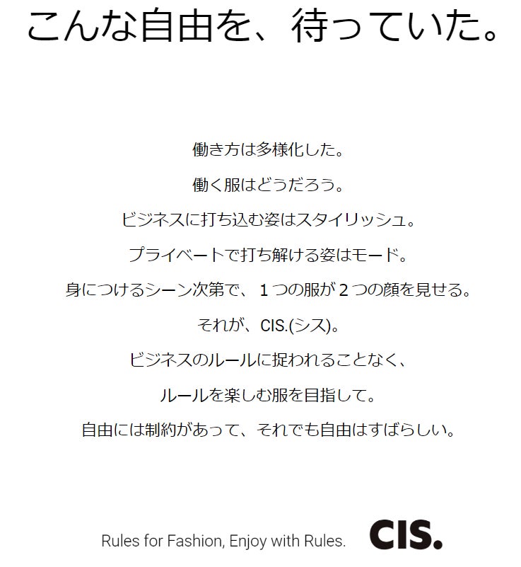 「CIS.」は、“Classic.Innovative.Stylish”の頭文字が由来で、“rules for fashion、enjoy with rules“をコンセプトに、ビジネスウエアという形式的なルールにとらわれず、あえてルールを楽しむようなモードビジネスアイテムを展開。様々な着こなしを想定し、デザインや生地、シルエットに加えて裏地やボタンなどすべてを黒石氏がこだわりを持って企画し、これまでにないビジネスアイテムや新たなレイヤードスタイルを提案します。