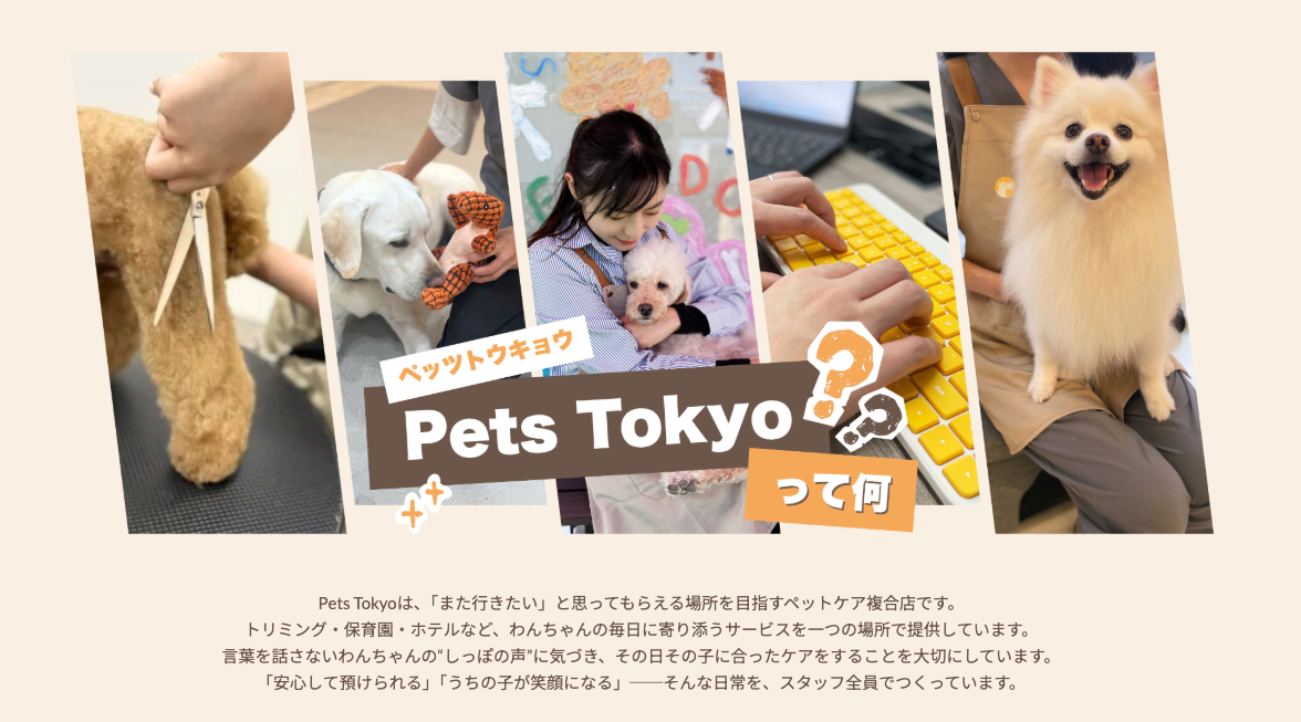 Pets Tokyoは、ペットと飼い主さんのための保育園を中心とした複合型ケアスペースです。