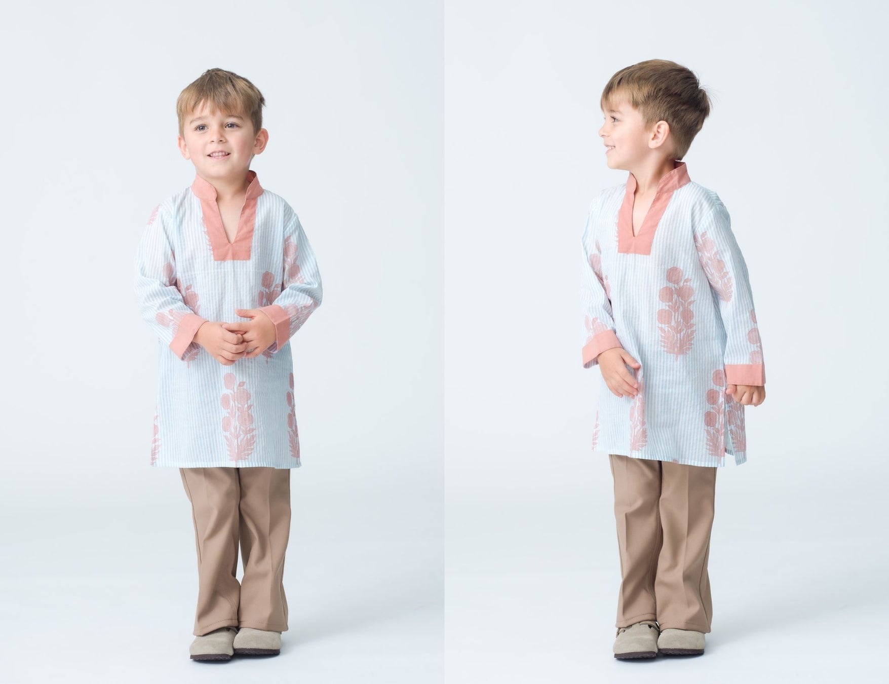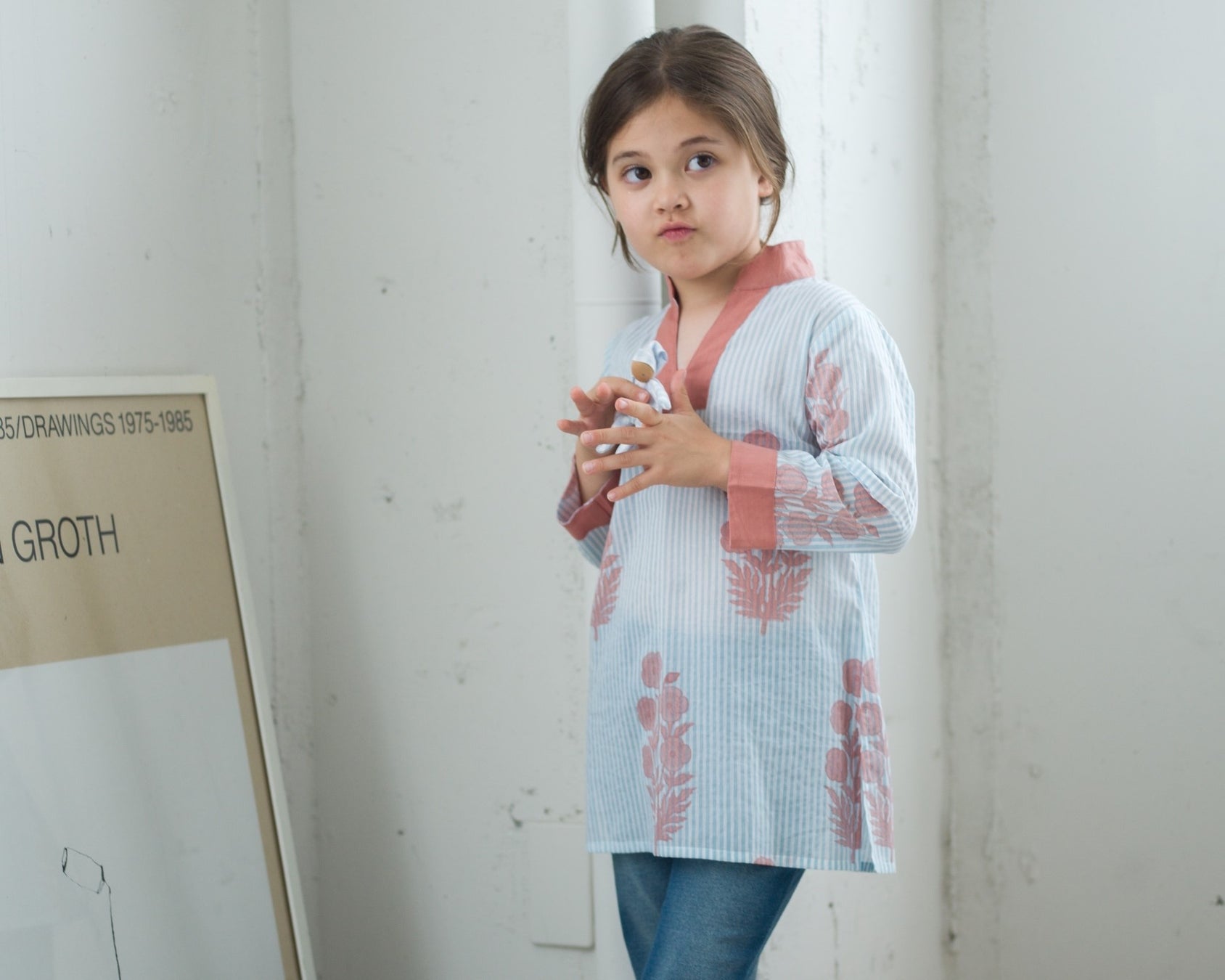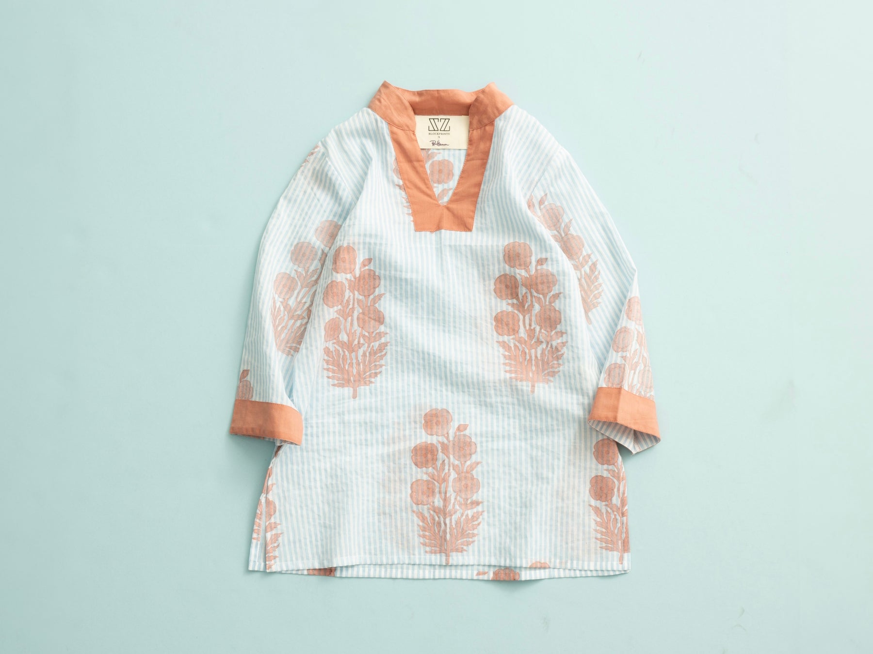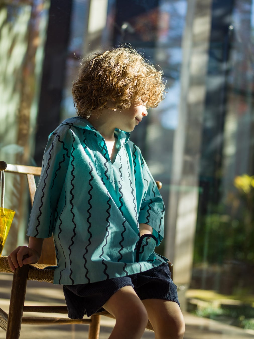 子どもたちが自然でエフォートレスに着用できるカフタンシャツ。ミディアム丈でゆったりとした袖とスキッパーネックライン、袖のスリットとラウンジ感のある1枚に仕上げました。涼しげで軽やかなコットン生地には、爽やかなストライプにポピースタンプが施されています。女の子も男の子も着用でき、さらに、背が伸び大きくなったらチュニックとしても長く愛用していただけるアイテムです。サマーシーズンのワードローブに持っていたい1着が完成しました。