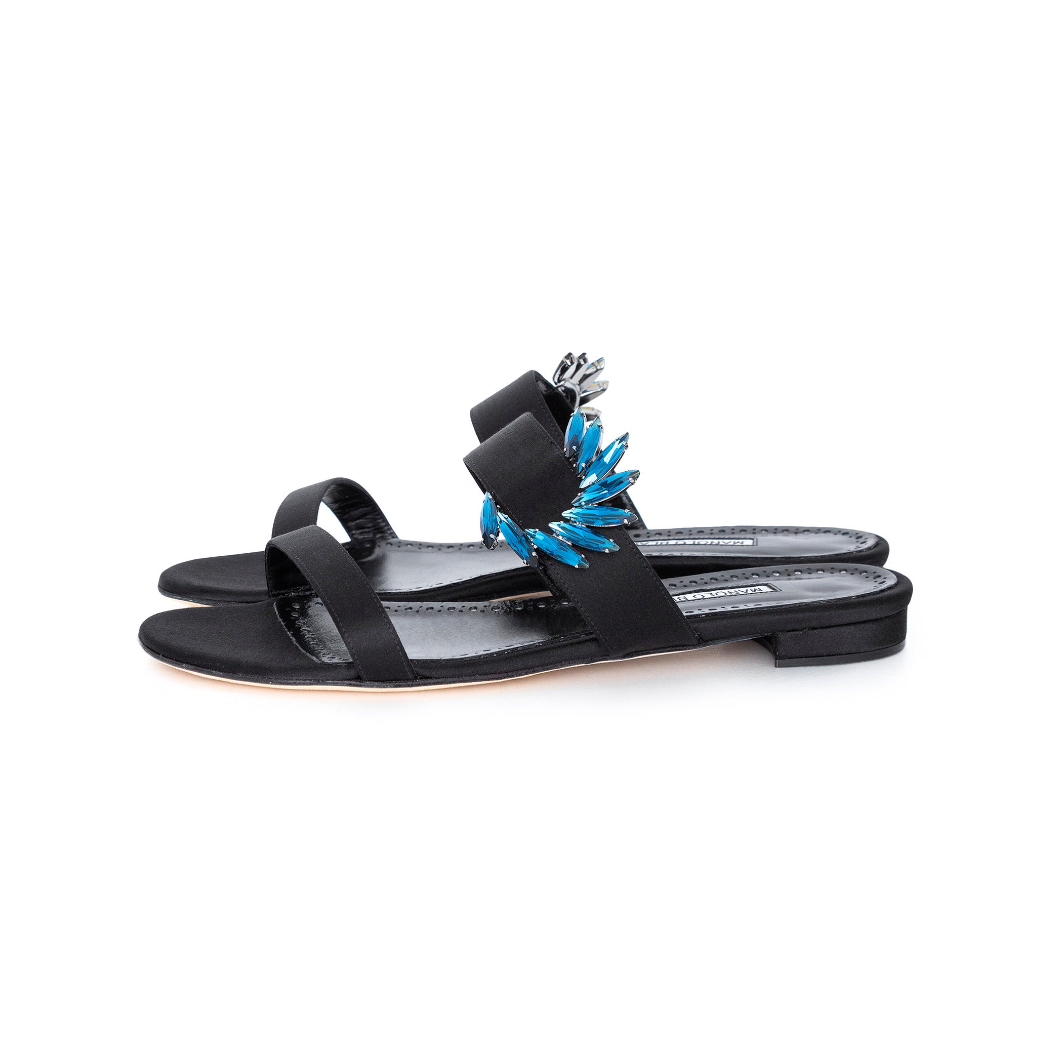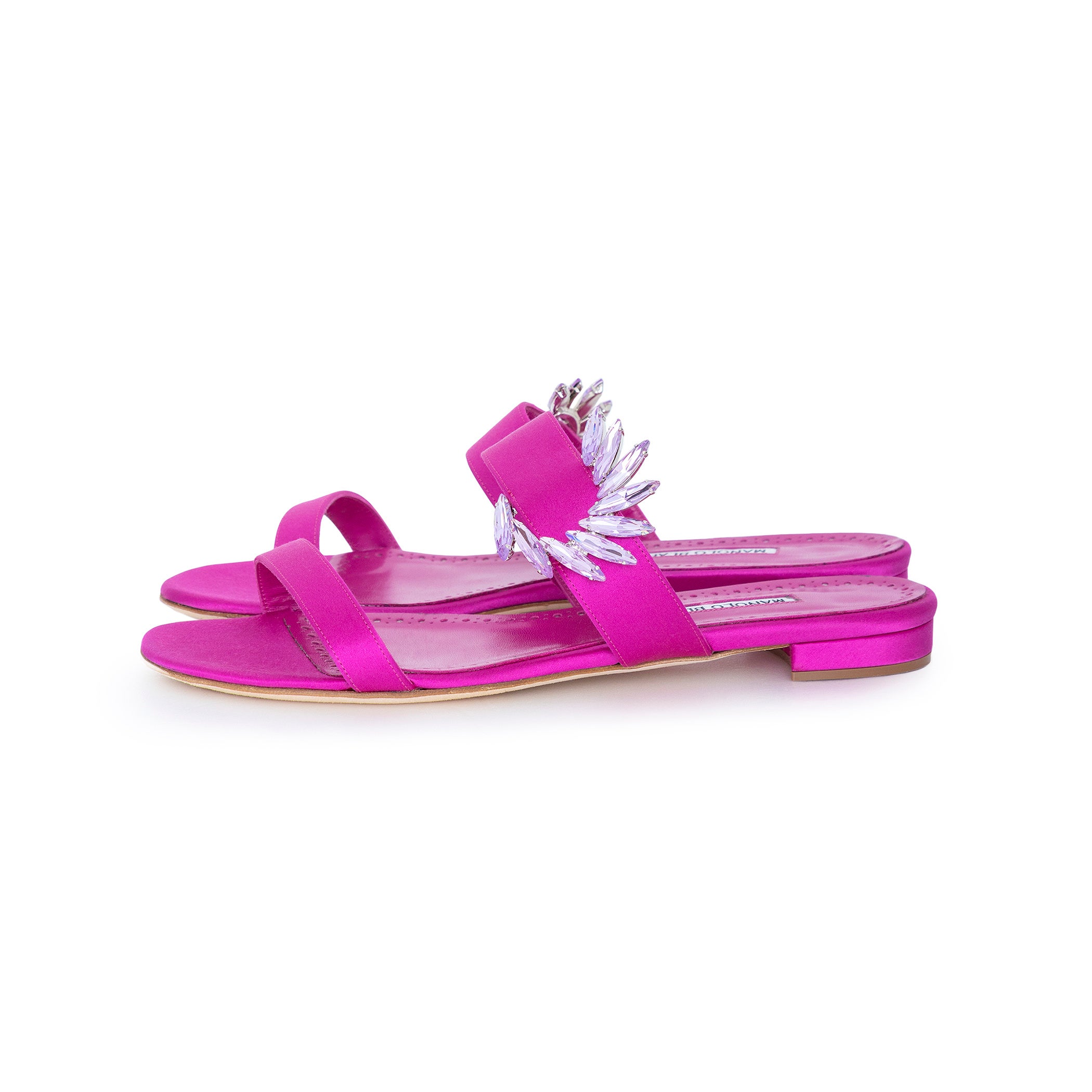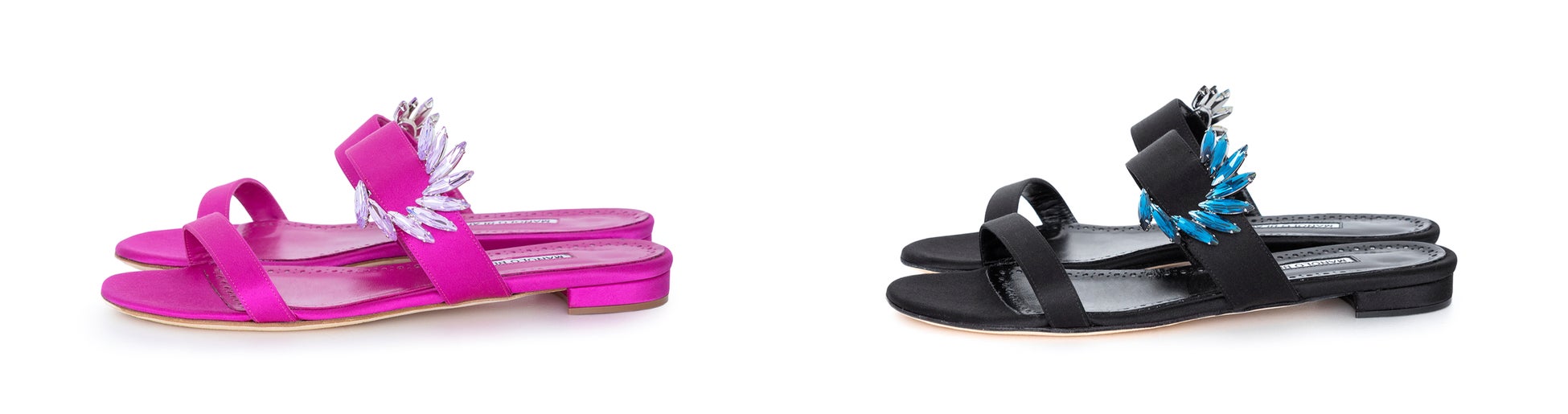 カールしたシダの装飾でエレガントなスタイルを表現する"CHIVELA"のデザインをベースに、ビジューを別注色で展開します。アウトソールには『MANOLO BLAHNIK for Drawer』の刻印入り。