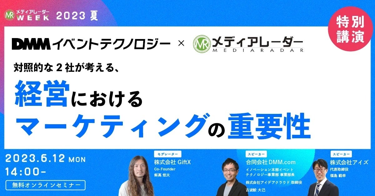 株式会社アイズ(所在地:東京都渋谷区、代表取締役社長:福島範幸、東証グロース:5242)が運営するNo.1*の広告業界のプラットフォーム「メディアレーダー」が主催するマーケティングセミナーイベント「第10回メディアレーダーWEEK 2023夏」にて、「DMM×メディアレーダー 特別公演」として合同会社DMM.com様が6/12(月)に登壇します。視聴申し込みは無料です。