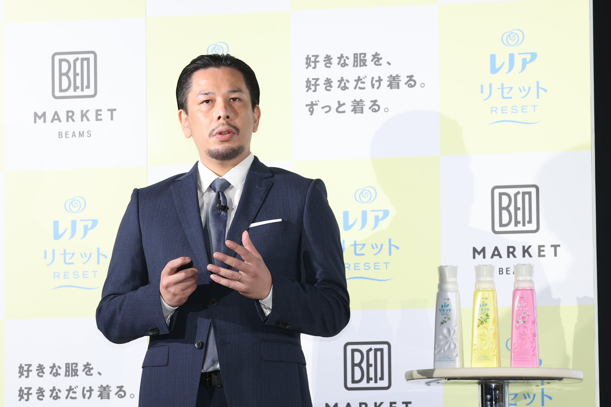 PRイベントの冒頭、P&G小林執行役員から、レノアの歴史、また、2020年に「衣類のダメージケア」を提供する第三の柔軟剤として発売した「レノアリセット」の紹介がありました。2022年11月中旬に、新しい香りの「シトラス&ヴァーベナ」を加えリニューアル発売したことに伴い、ビームスにも賛同頂いている新しいプロジェクト「好きな服を好きなだけ着る。ずっと着る。」を開始。このプロジェクトにおいて、「ビームススタッフにも太鼓判を押して頂いているレノアリセットを使用してもらい、洋服を大切に着ていただくことで、環境配慮にも貢献していきたいです。」とコメント。