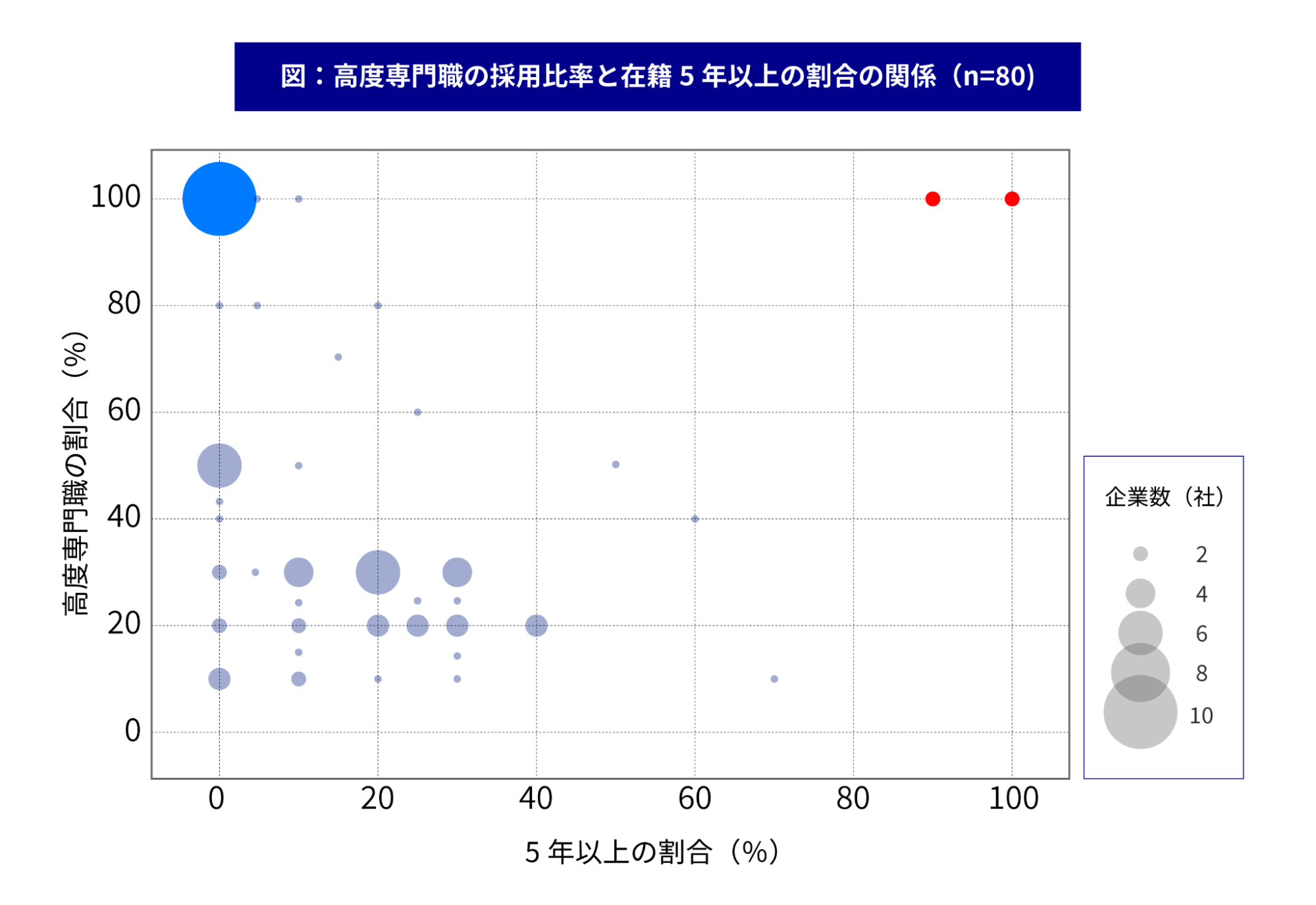在籍5年以上の割合は0〜20%に集中しており、長期定着は限定的であることが示されました。特に、高度専門職比率が100%でありながら在籍1年未満が中心の企業(青い点)も見られ、採用の新規化や定着途上の状況が示唆されます。一方で、高度専門職のみで構成され、かつ9割以上が5年以上在籍する企業(赤い点)も見られ、採用と長期定着を両立する例も確認されました。