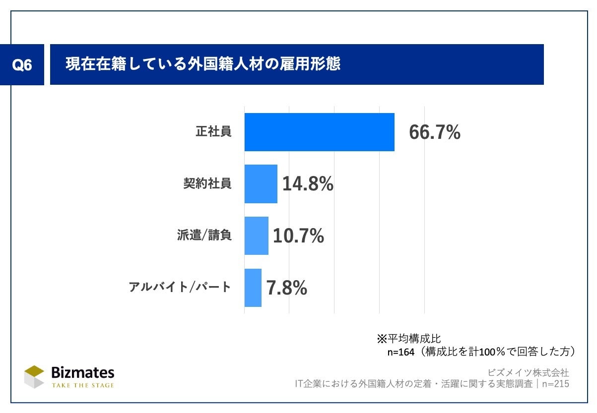 Q1で「0%(過去に採用実績あり)」「わからない/答えられない」以外を回答した企業(n=215)を対象に、Q6.「現在在籍中の外国籍社員の雇用形態」を尋ね、有効回答164社の平均構成比を算出しました。