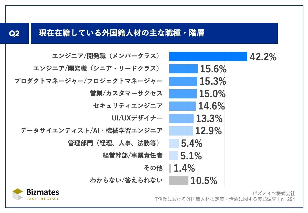 Q2.「現在在籍している外国籍人材の主な職種・階層」(n=294)では、「エンジニア/開発職(メンバー)」が42.2%、「同(シニア・リード)」が15.6%と、約6割を占めました。外国籍人材は、専門スキルを持つ即戦力として、開発・技術領域での採用が中心であることがうかがえます。