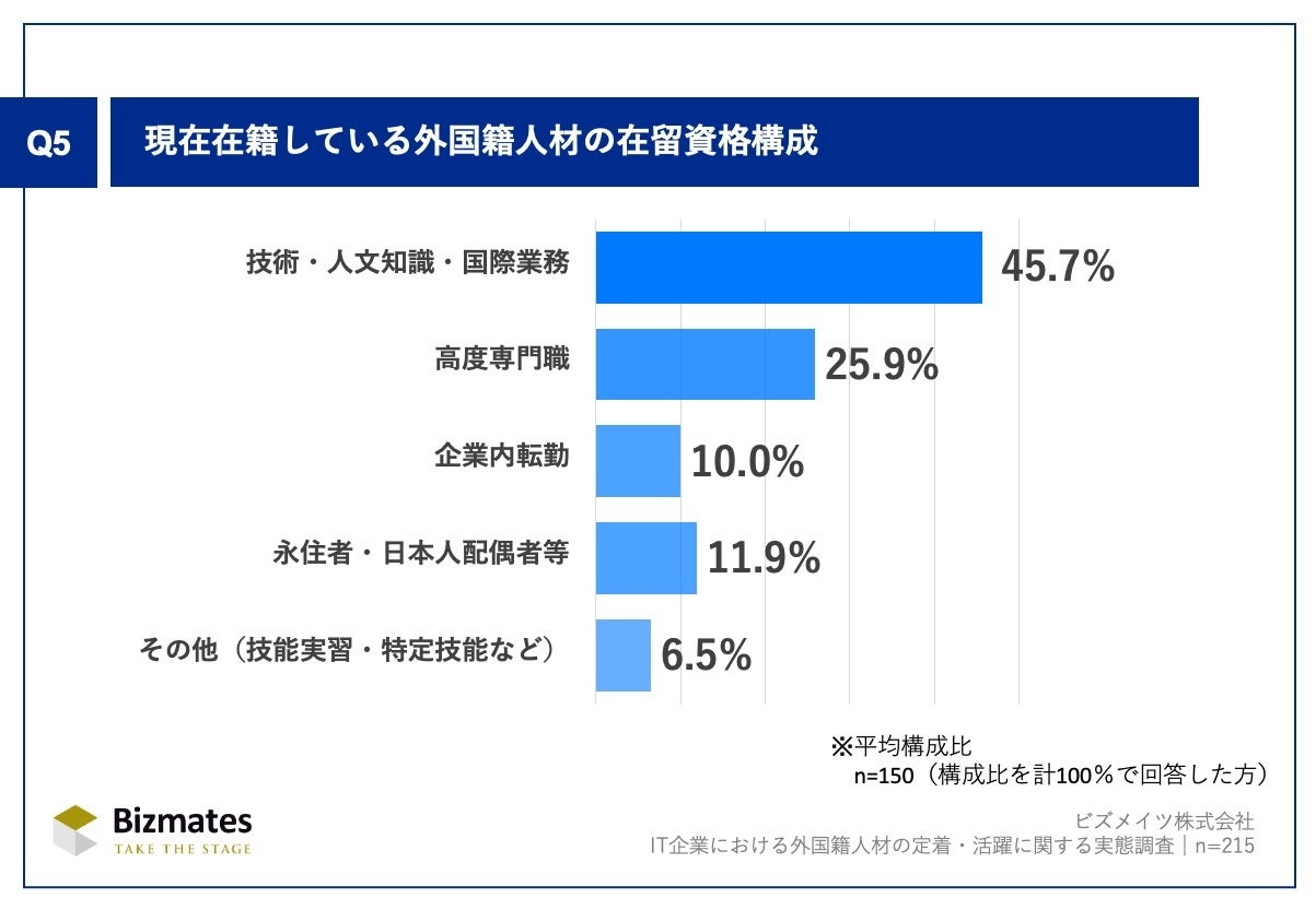 Q1で「0%(過去に採用実績あり)」「わからない/答えられない」以外を回答した方(n=215)を対象に、Q5.「現在在籍している外国籍人材の在留資格構成」を尋ね、有効回答150社(n=150)の平均構成比を算出しました。