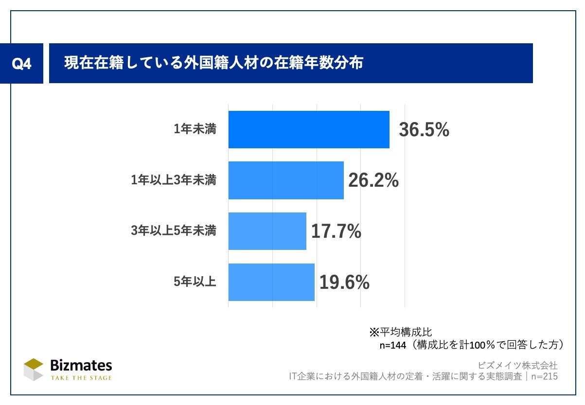 Q1で「0%(過去に採用実績あり)」「わからない/答えられない」以外を回答した方(n=215)を対象に、Q4.「現在在籍している外国籍人材の在籍年数分布」を尋ね、有効回答144社(n=144)の平均構成比を算出しました。その結果、「1年未満」36.5%、「1年以上3年未満」26.2%と、合計62.7%が「3年未満」を占めました。外国籍人材の受け入れを近年開始した企業が多いことに加え、プロジェクト型の就業やキャリアアップを目的とした転職など、人材の流動性の高さが背景にあると考えられます。一方で、「3年以上」37.3%、「5年以上」19.6%と一定数存在しており、長期定着も進みつつあることが示されました。