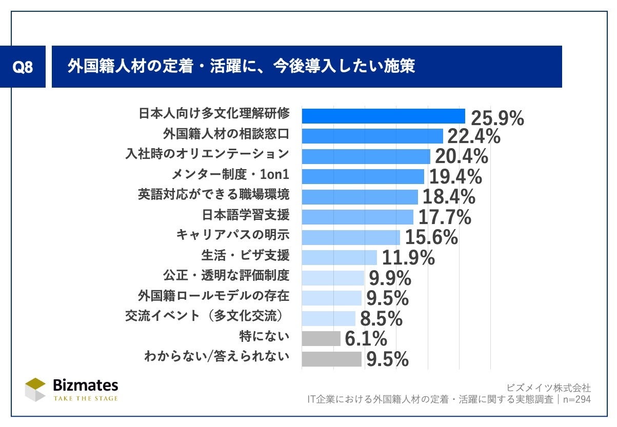 Q8.「外国籍人材の定着・活躍のために、今後導入したい施策」(n=294)について尋ねた結果、「日本人向けの多文化理解研修」25.9%が最多となりました。これは、日本人側の理解・受け入れ力を高める必要性が強く認識されていることが分かります。実際、Q7(現行施策)でも同項目が上位に入っており、文化的相互理解は定着支援の中心テーマとなりつつあります。次いで「外国籍人材の相談窓口」22.4%、「入社時のオリエンテーション」20.4%、「メンター制度・1on1」19.4%が続き、心理的安全性や初期フォロー体制の整備ニーズが高いことがうかがえます。いずれもQ7で「効果が高い」と評価された施策であり、重要性は認識されている一方で、導入が進んでいない領域といえます。また、「英語対応ができる職場環境」18.4%や「日本語学習支援」17.7%など、言語支援へのニーズも引き続き大きい状況です。