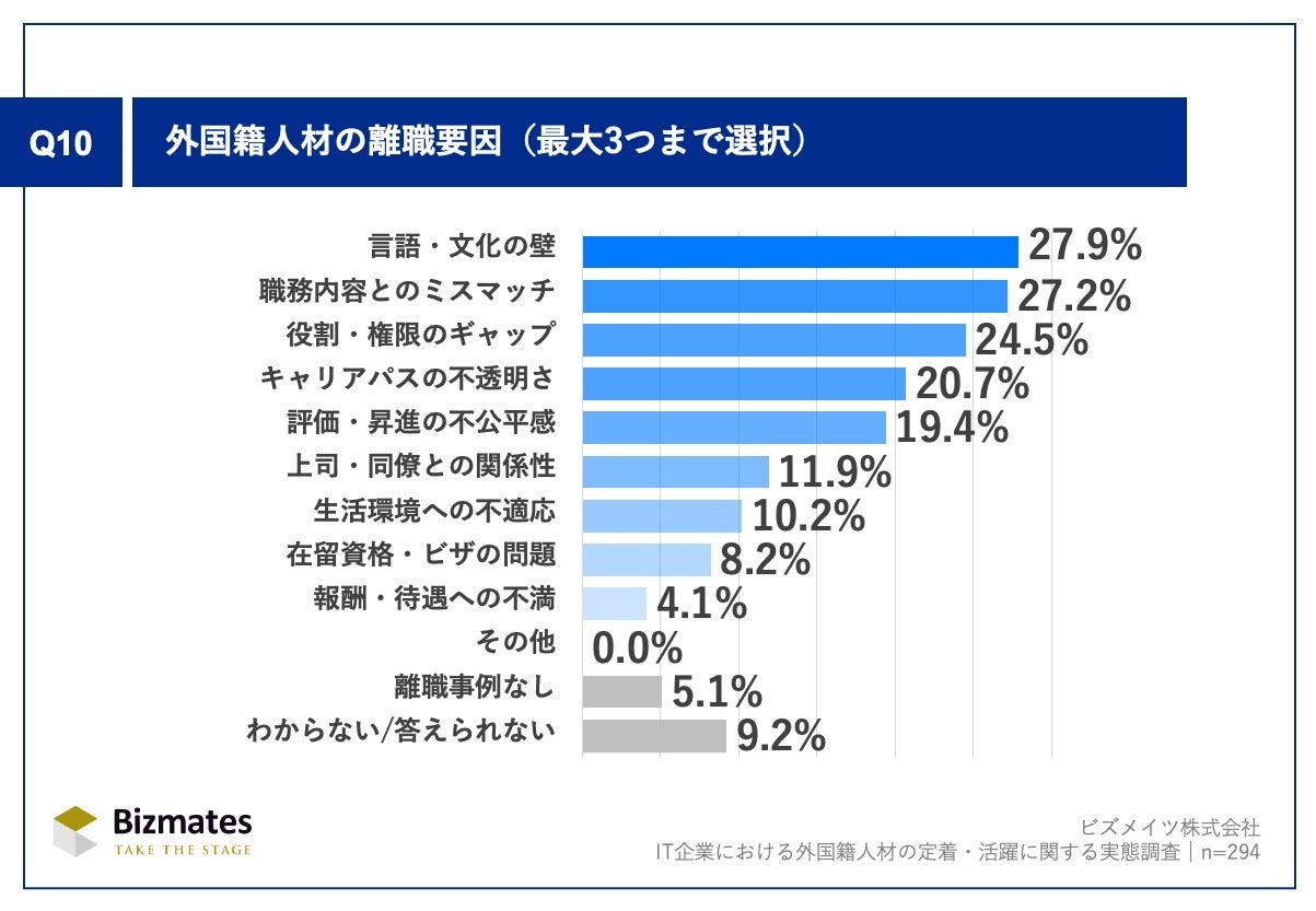 Q10.「外国籍人材の離職要因」(n=294)の結果では、「言語・文化の壁」27.9%が最も多く、「職務内容とのミスマッチ」27.2%、「役割・権限のギャップ」24.5%が続きました。一方、「報酬・待遇への不満」4.1%は最下位にとどまり 、離職は条件面ではなく、職務や権限の認識差 や 言語・文化面での相互理解不足 に起因していることが示されています。