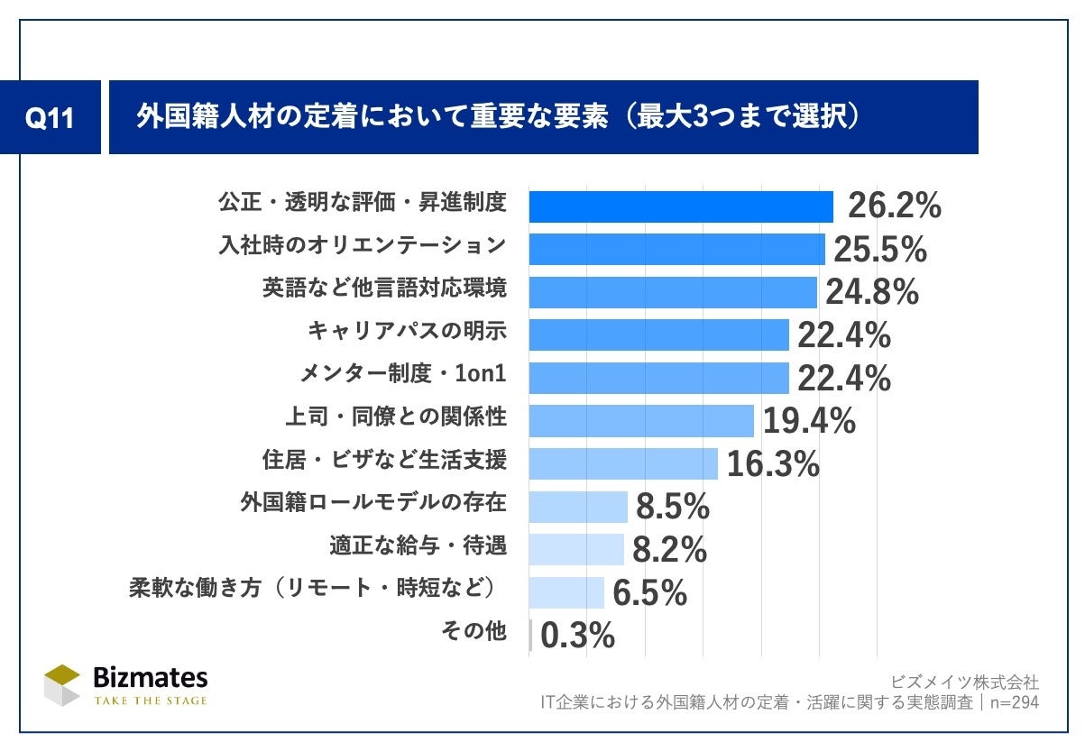 Q11.「外国籍人材の定着において、重要な要素」(n=294)では、「公正・透明な評価・昇進制度」26.2%が最多となり、評価や昇進における納得感・公平性の重要性が示されました。次いで「入社時のオリエンテーション」25.5%が続き、「初期フォロー」が定着支援の最重要要素であることを裏付けています。