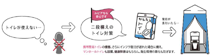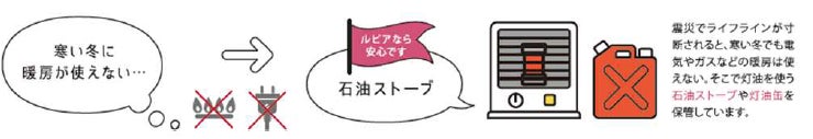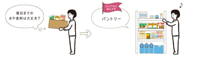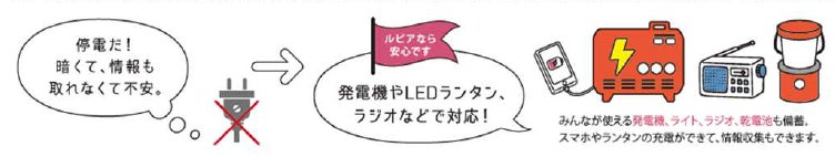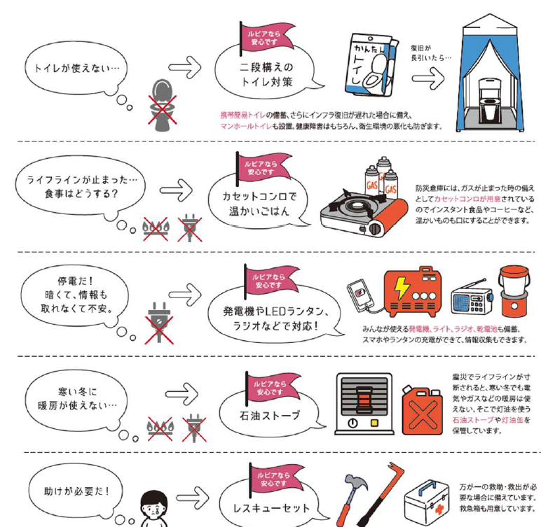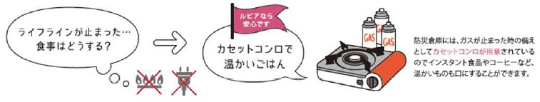 建物内には、防災備蓄倉庫を用意し、携帯簡易トイレ、マンホールトイレ、カセットコンロ、発電機、ライト、ラジオ、乾電池、石油ストーブ、灯油缶、救急箱などの防災グッズを保管し、緊急時の活用および居住者での防災拠点の設置を可能とします。